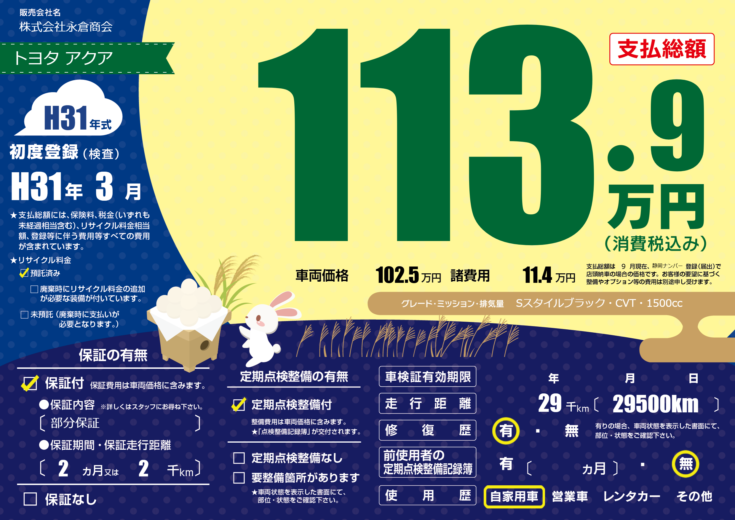 | 走行キロ | 2.9万km | 初年度登録 | H31年3月 |