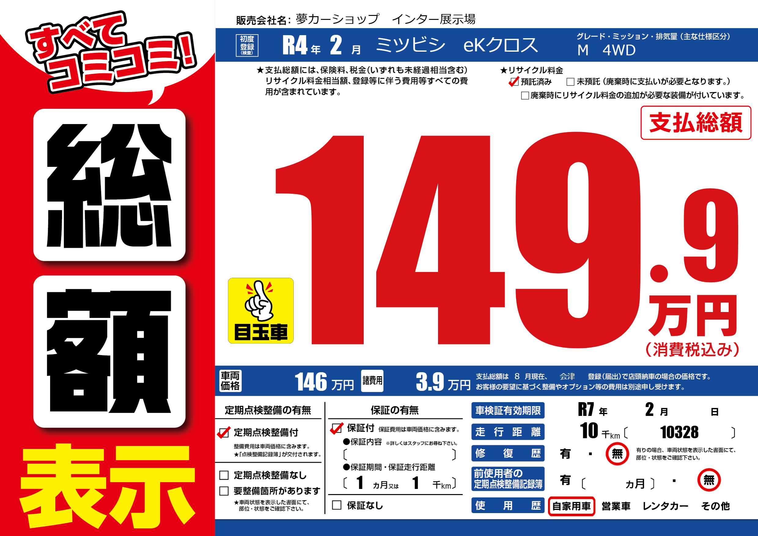 | 車検制限 | R7年 2月 - 日 | ||