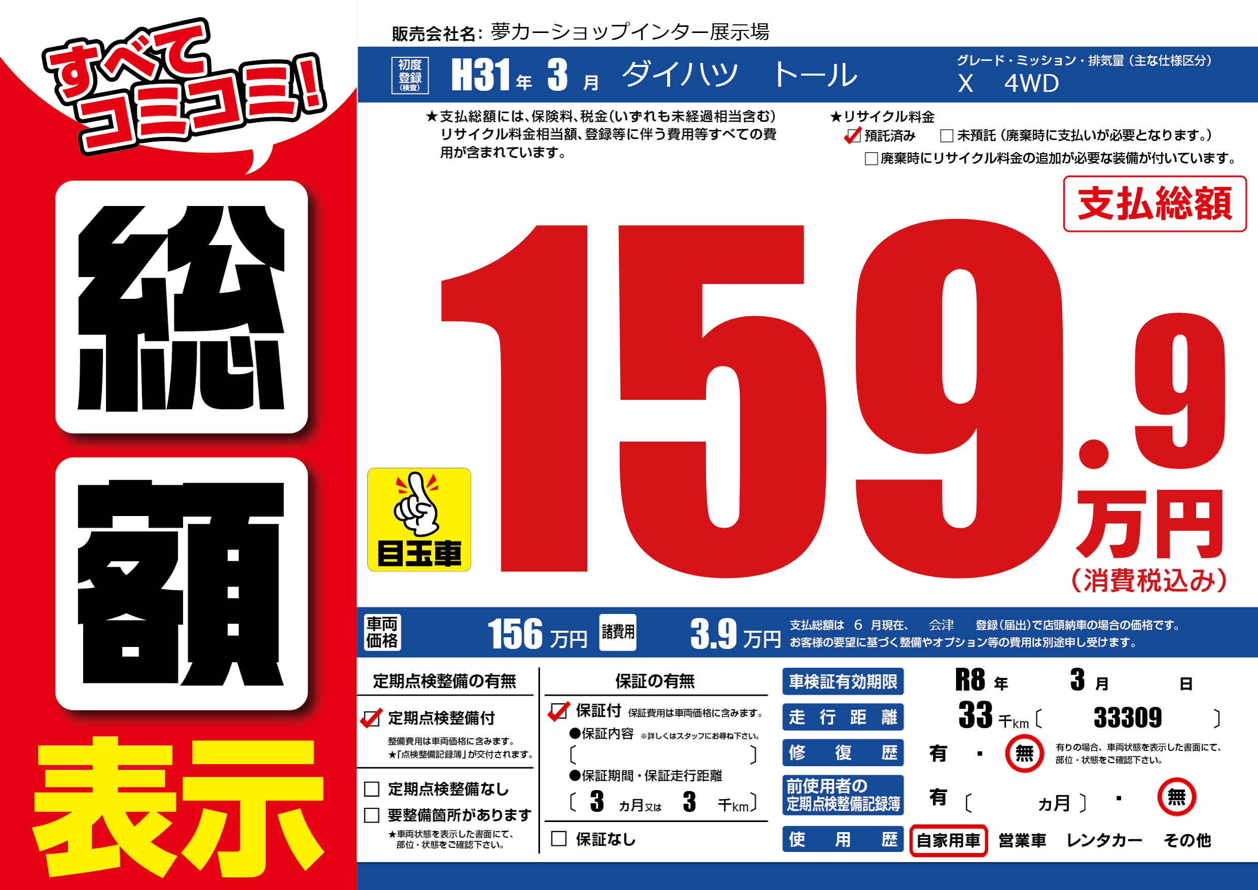 | 車名 | ダイハツ トール | グレード ミッション 排気量 |