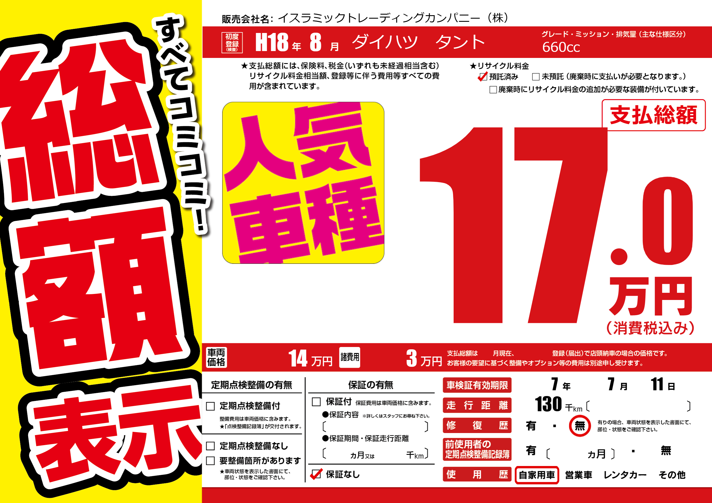 | 走行キロ | 13万km | 初年度登録 | H18年8月 |