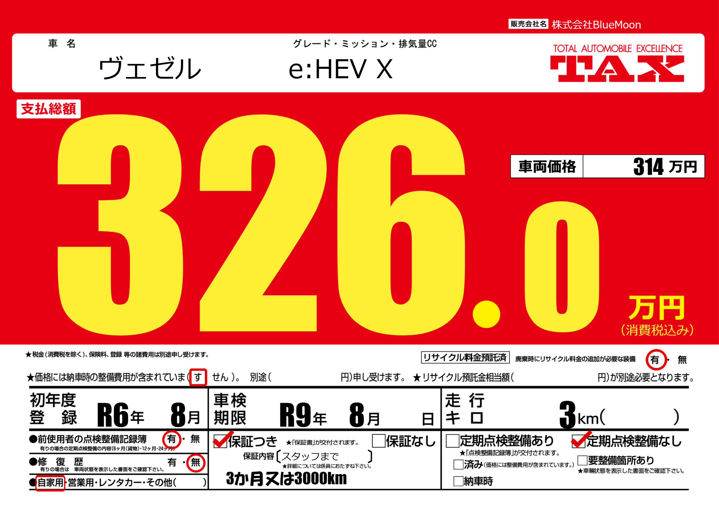 | 走行キロ | 0.3万km | 初年度登録 | R6年8月 |