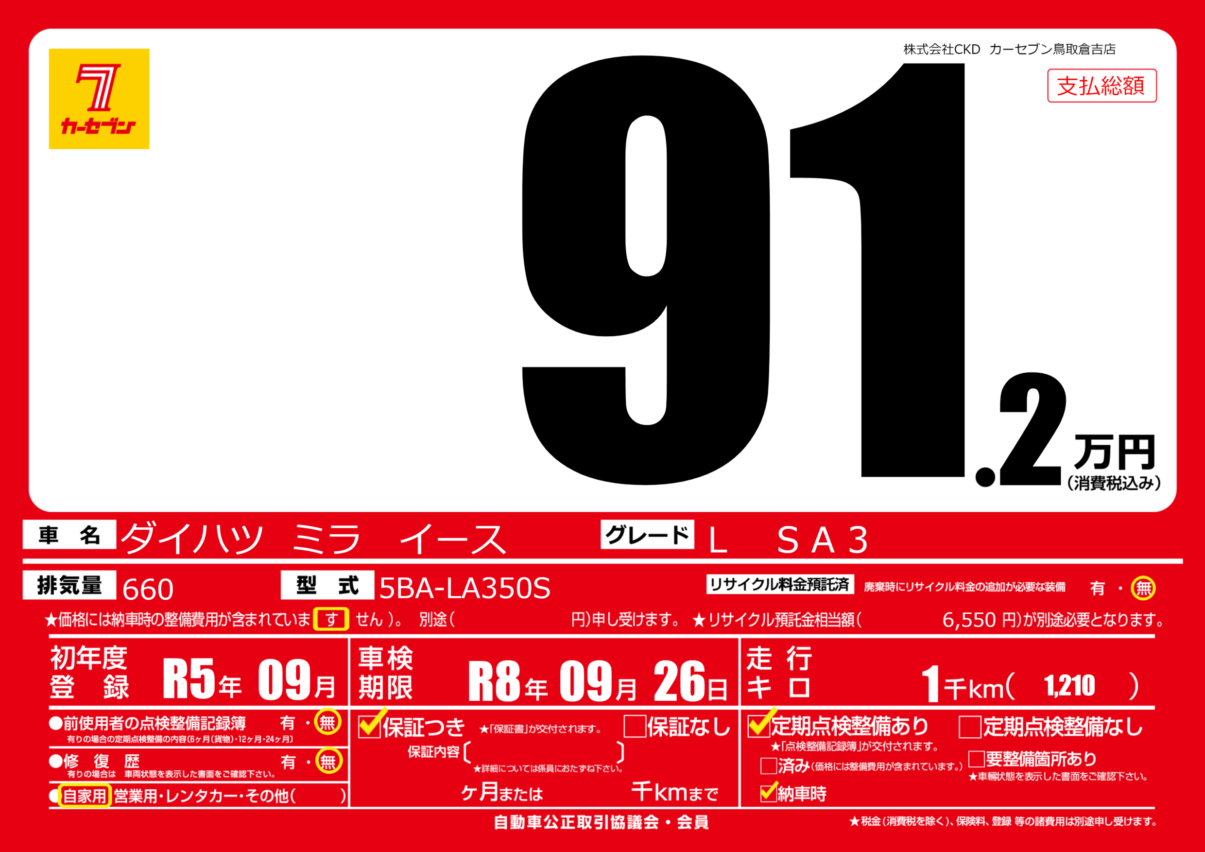| 走行キロ | 0.1万km | 初年度登録 | R5年09月 |
