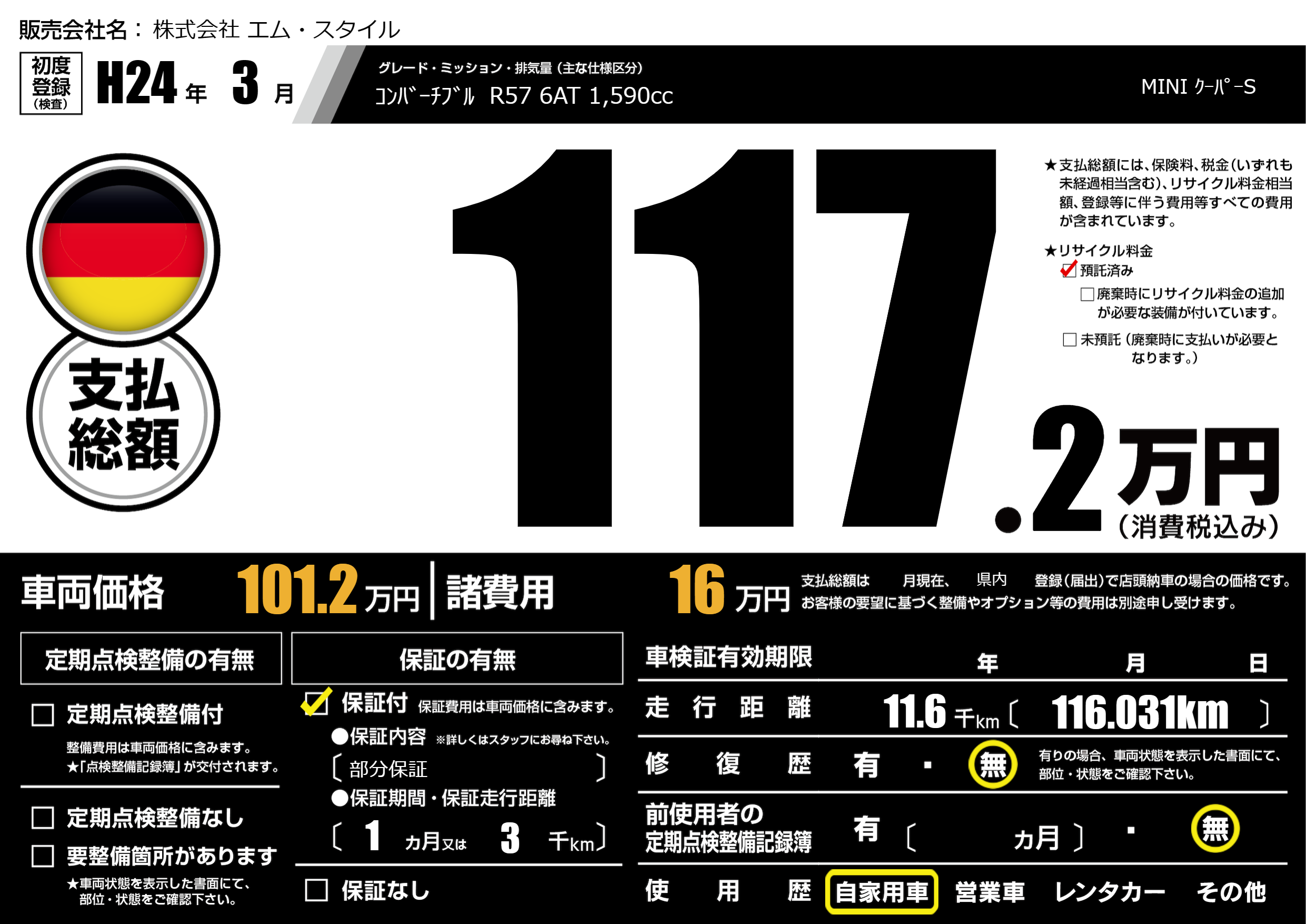 | 車名 | MINI クーパーS | グレード ミッション 排気量 |