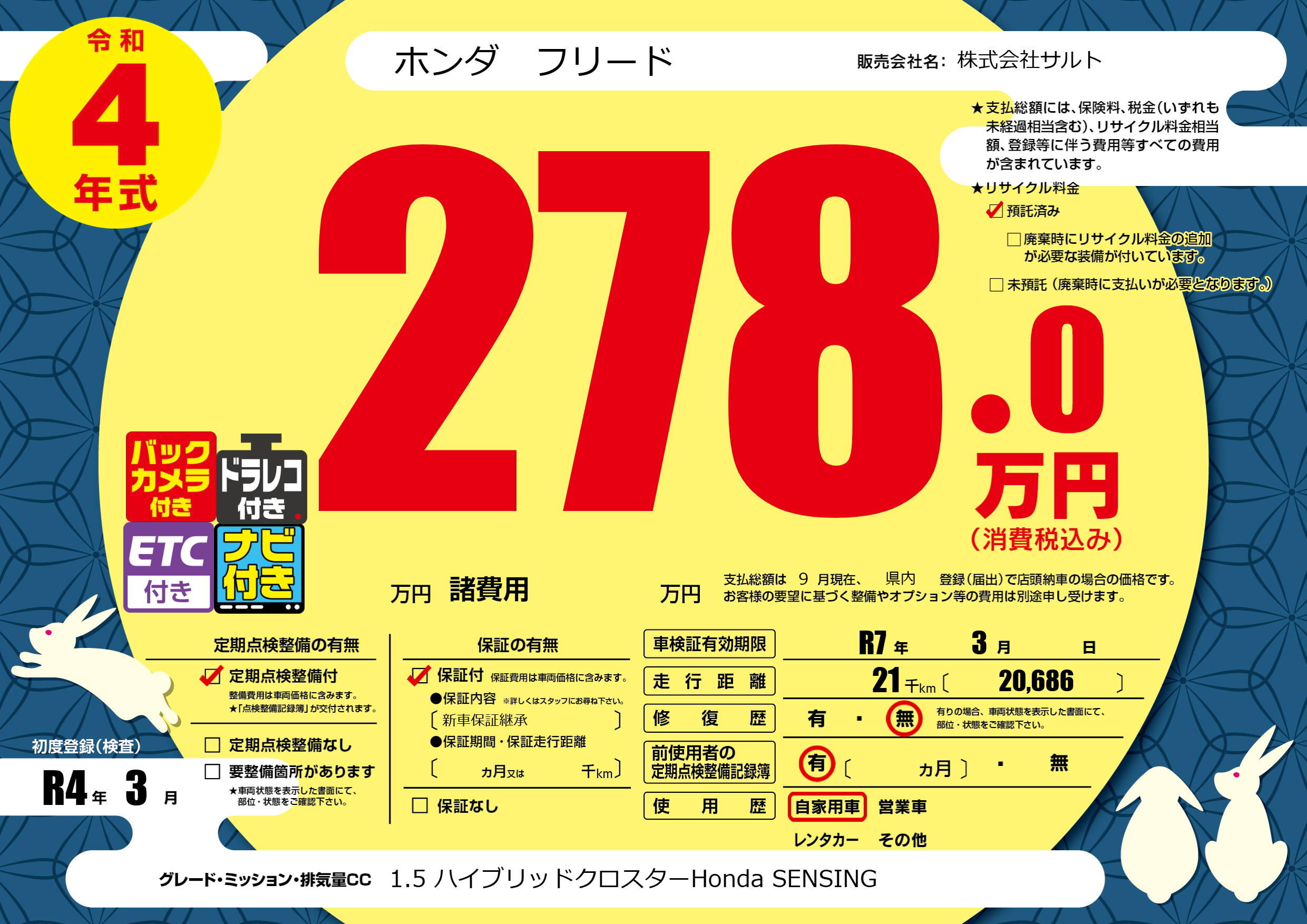 | 車名 | ホンダ フリード | グレード ミッション 排気量 |
