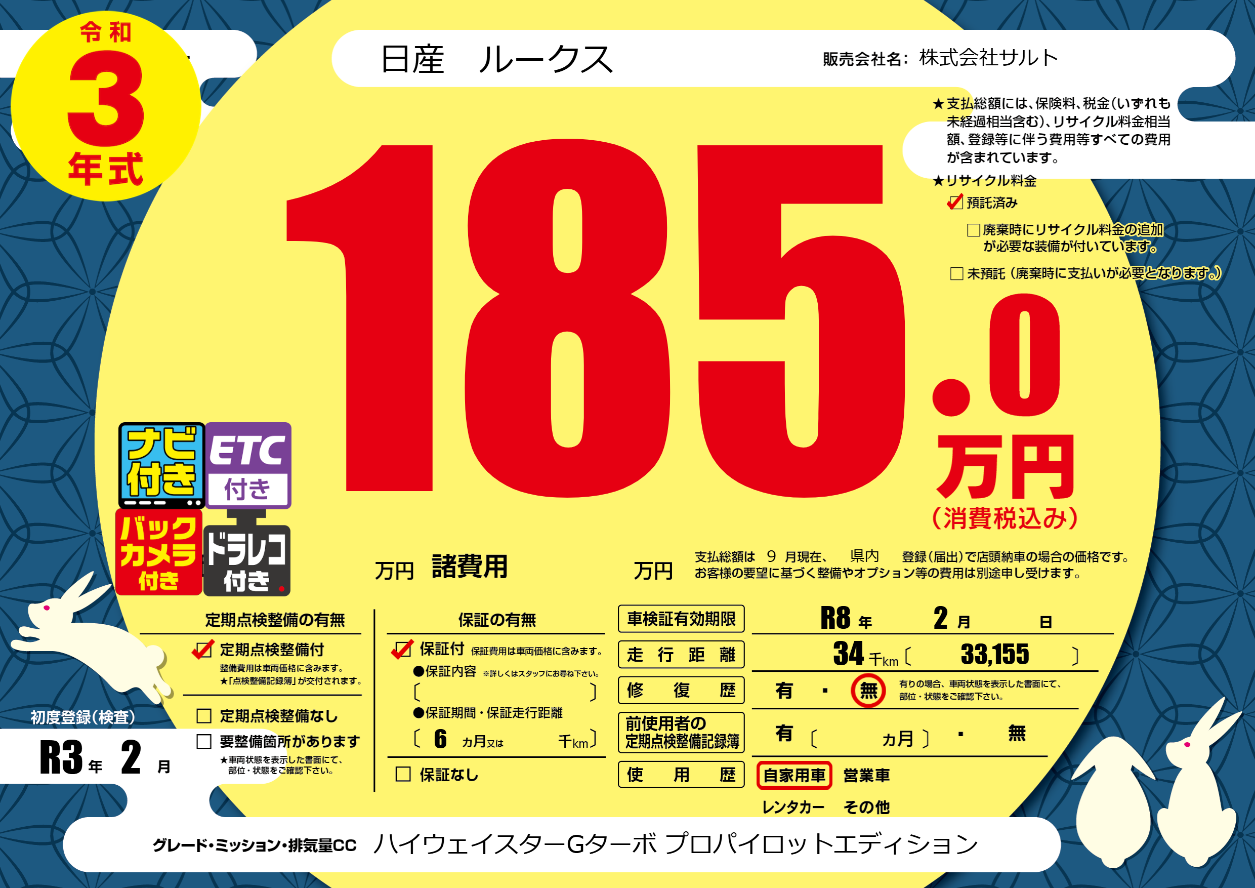 | 走行キロ | 3.4万km | 初年度登録 | R3年2月 |