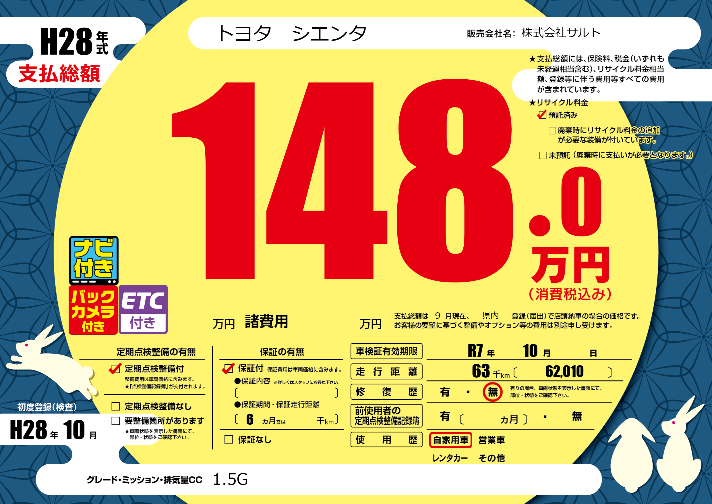 | 車名 | トヨタ シエンタ | グレード ミッション 排気量 |