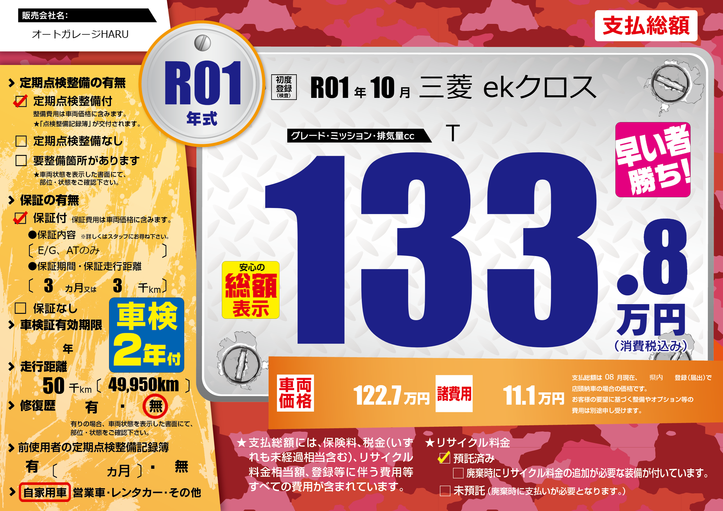 | 走行キロ | 5万km | 初年度登録 | R01年10月 |