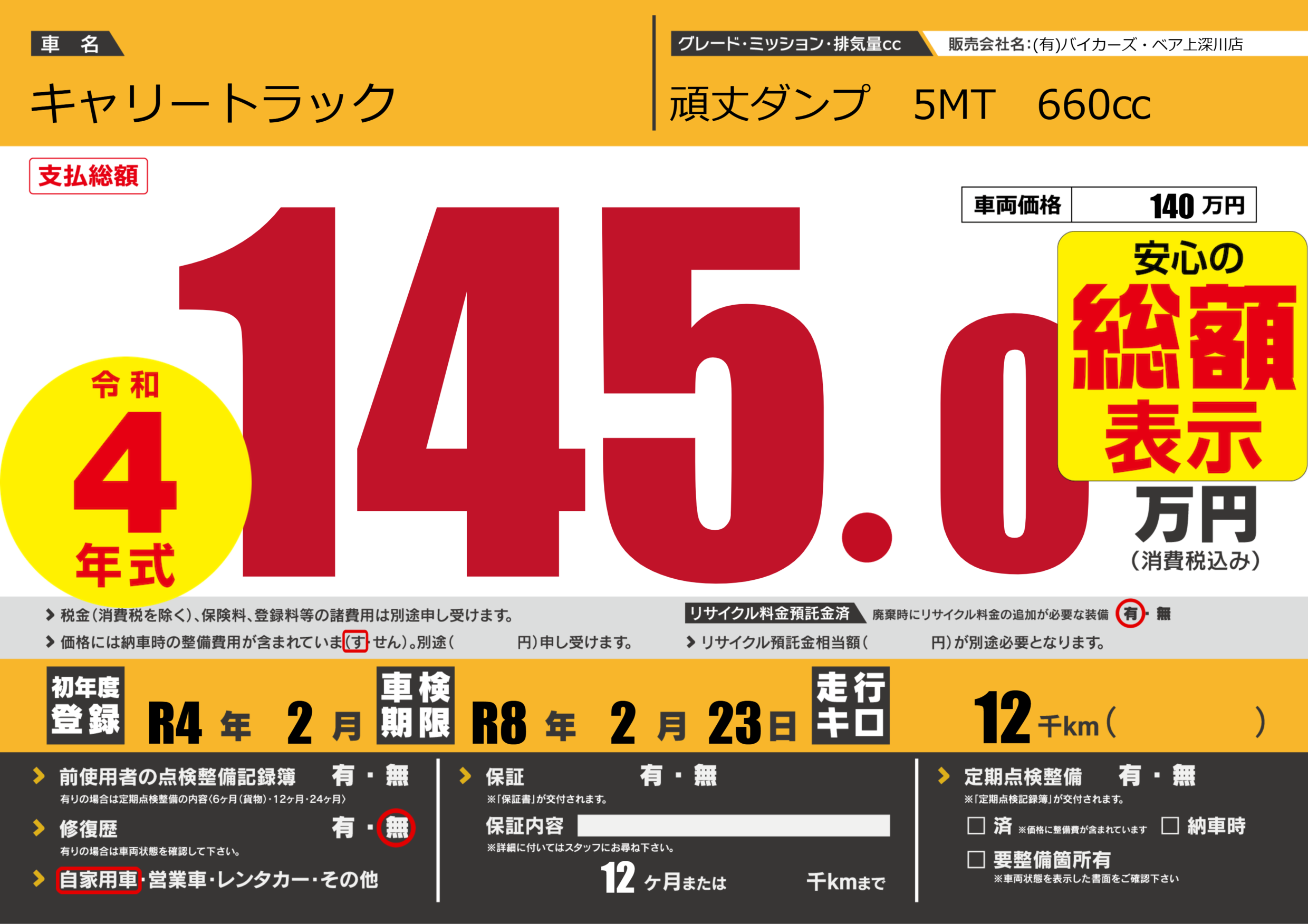 保証なし 保証内容(---) 12ヶ月または()千kmまで |