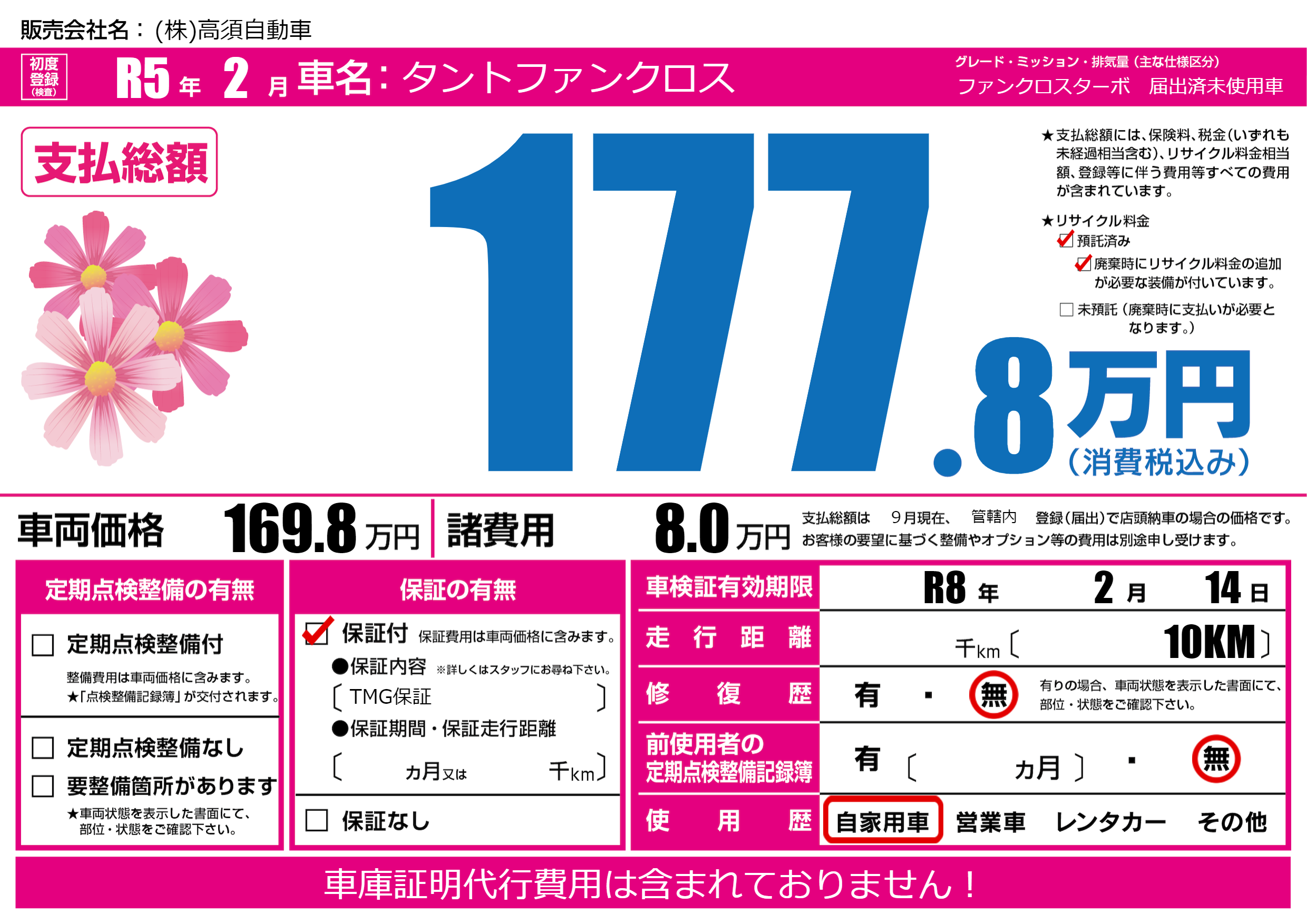 | 車名 | タントファンクロス | グレード ミッション 排気量 |