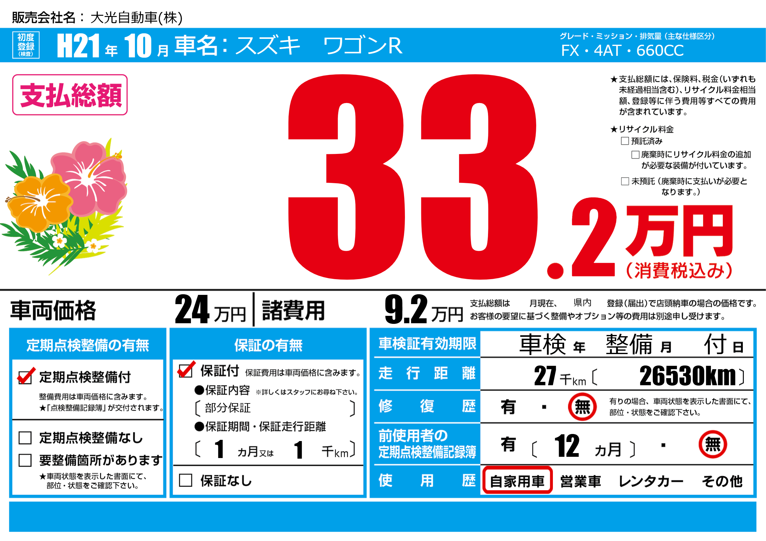 | 車名 | スズキ ワゴンR | グレード ミッション 排気量 |