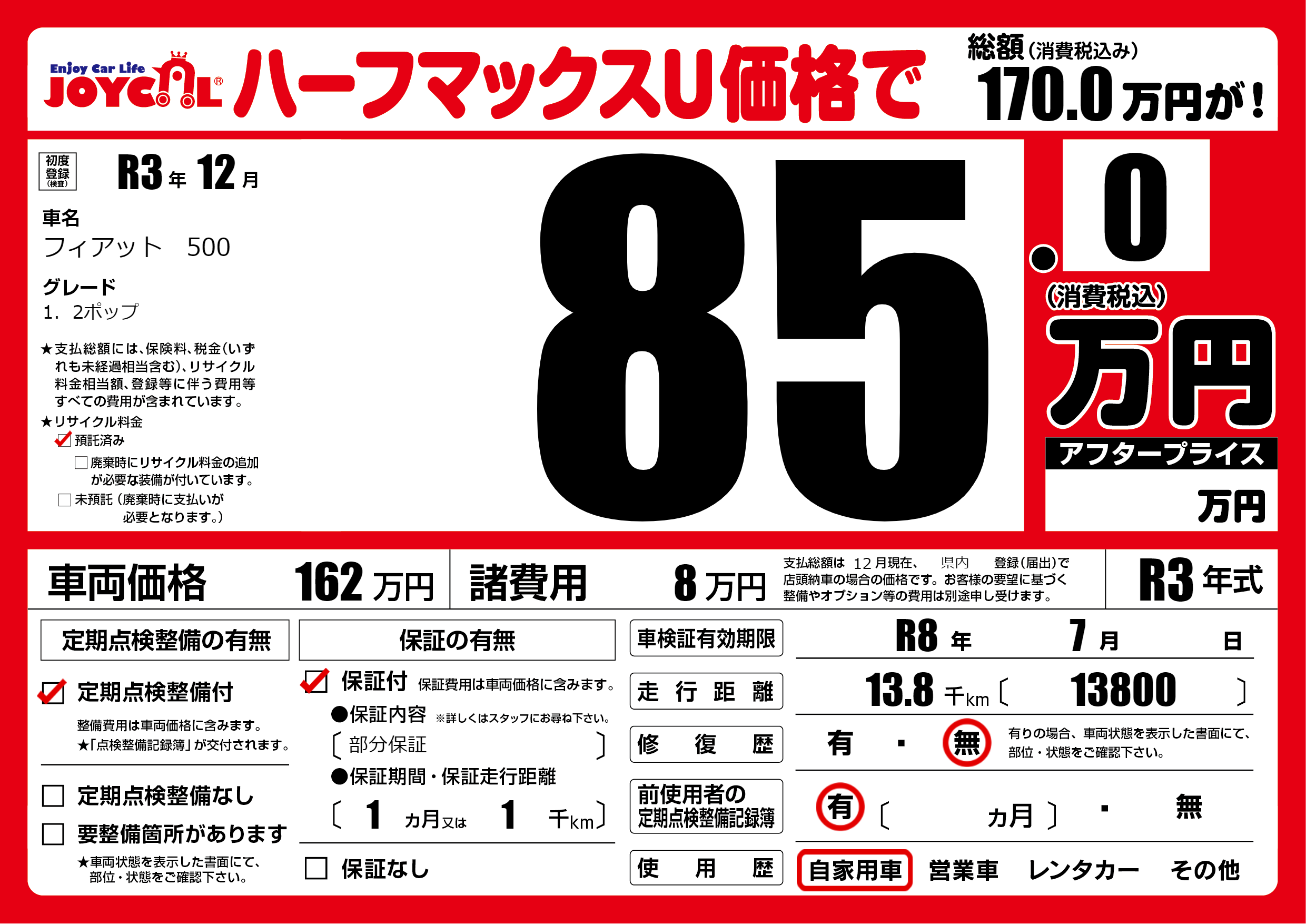| 車名 | フィアット 500 | グレード ミッション 排気量 |