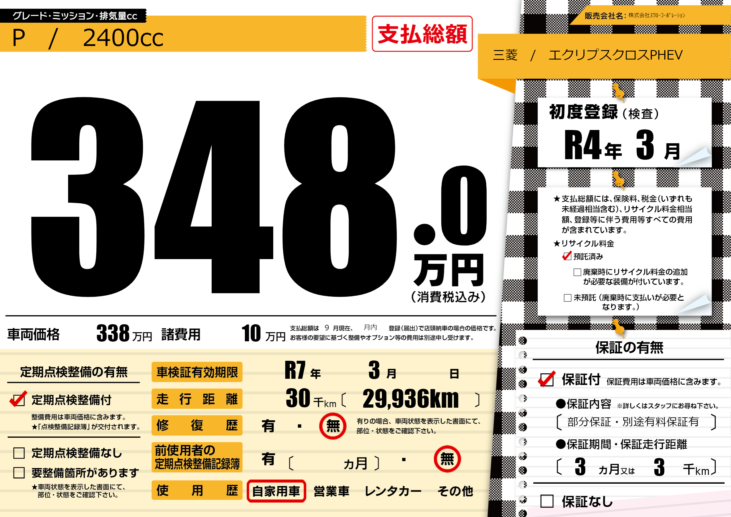 | 車名 | 三菱 / エクリプスクロスPHEV | グレード ミッション 排気量 |