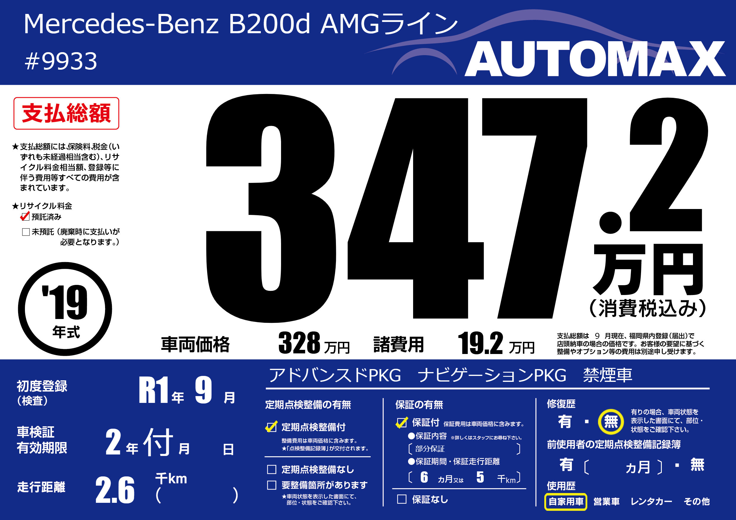 | 車名 | Mercedes-Benz B200d AMGライン | グレード ミッション 排気量 |