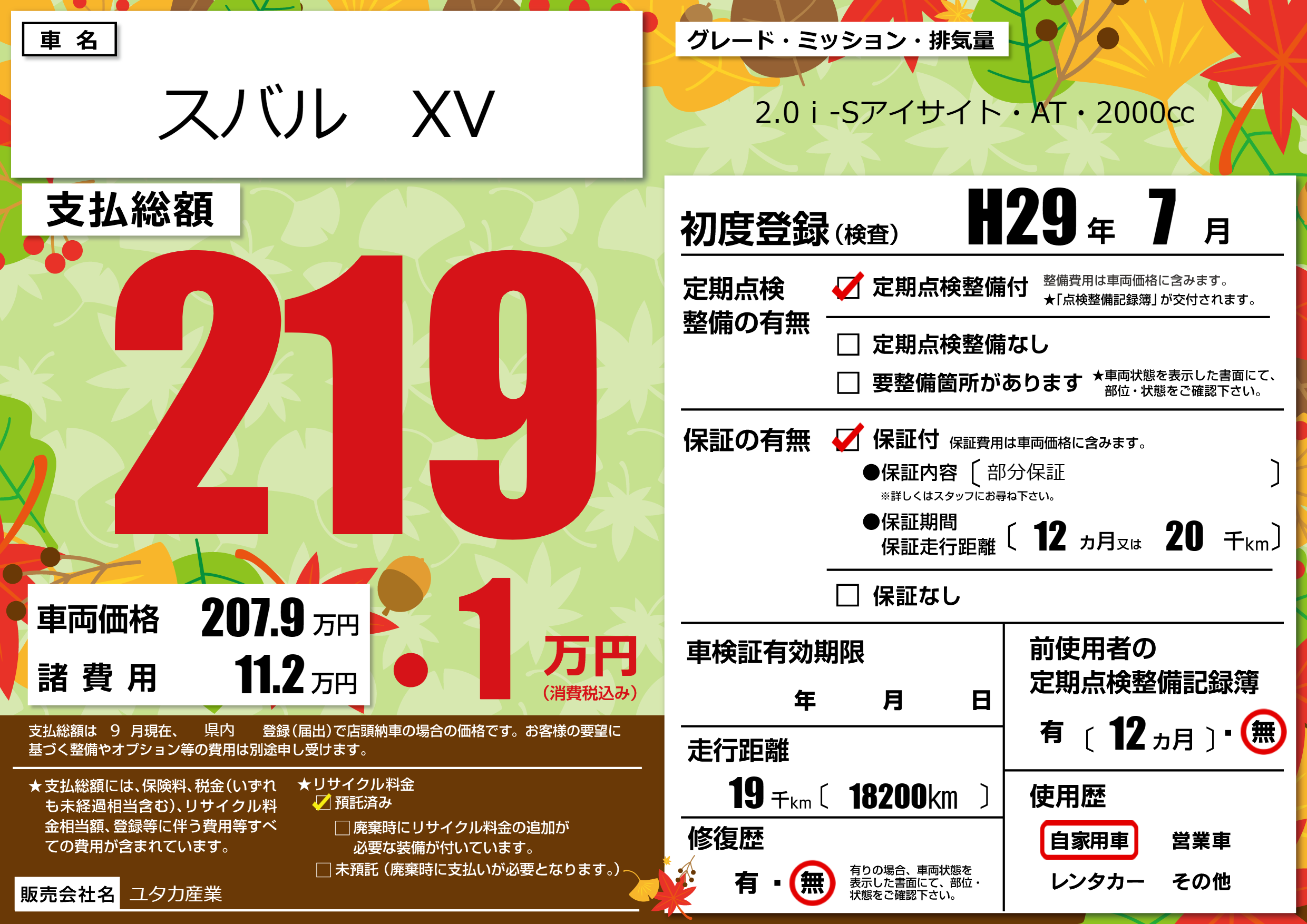 | 車名 | スバル XV | グレード ミッション 排気量 |