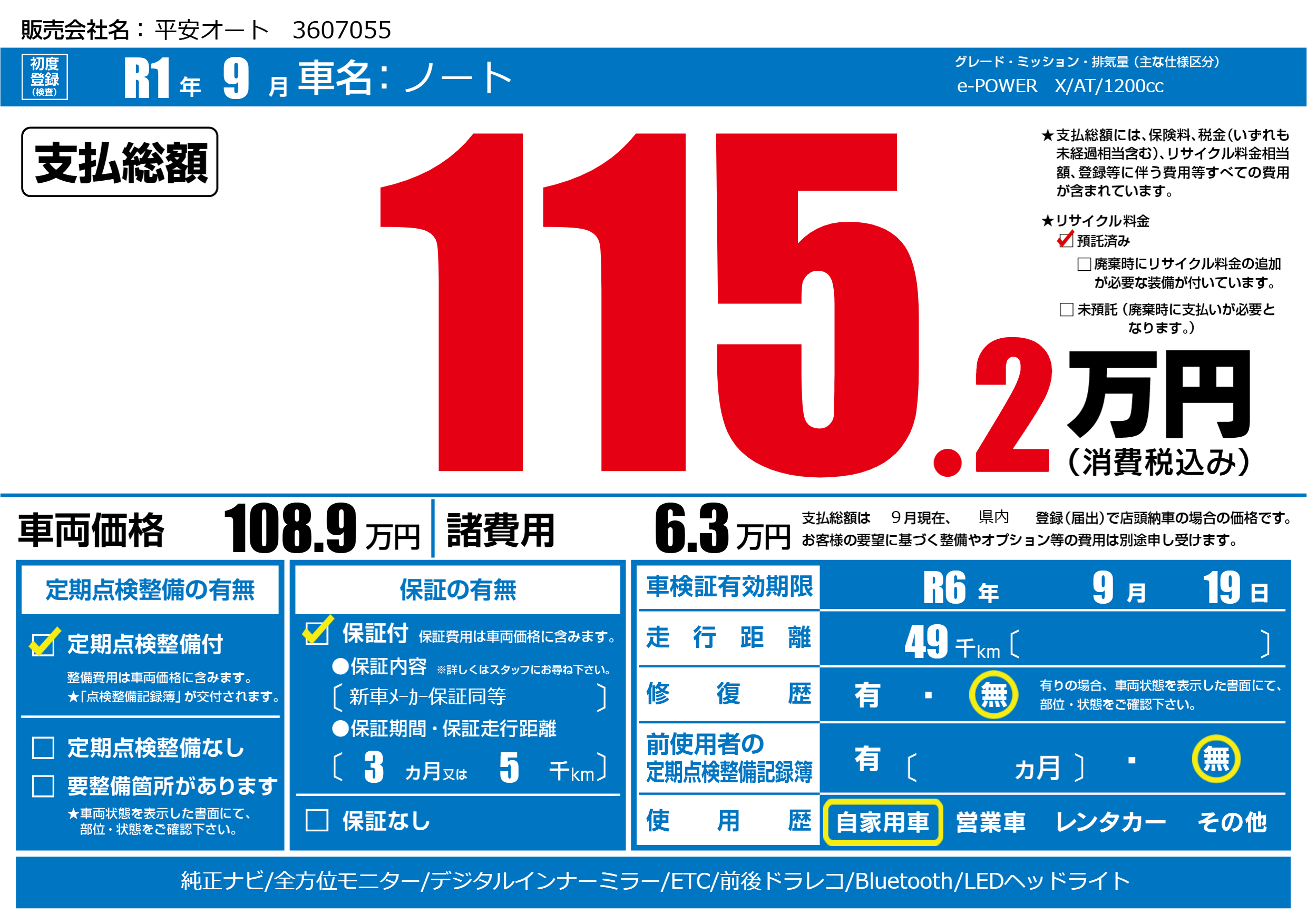| 走行キロ | 4.9万km | 初年度登録 | R1年9月 |