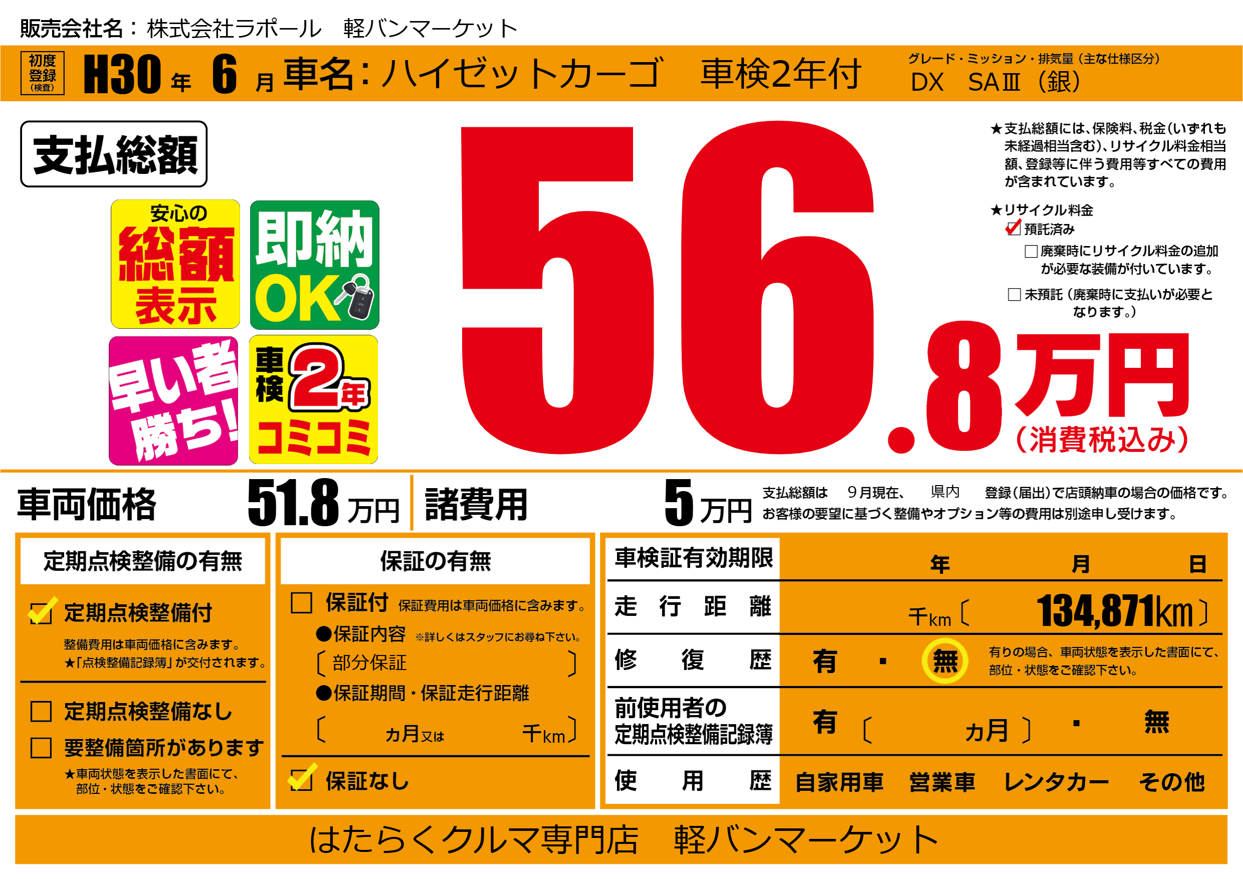保証なし 保証内容(部分保証) ---ヶ月または()千kmまで |
