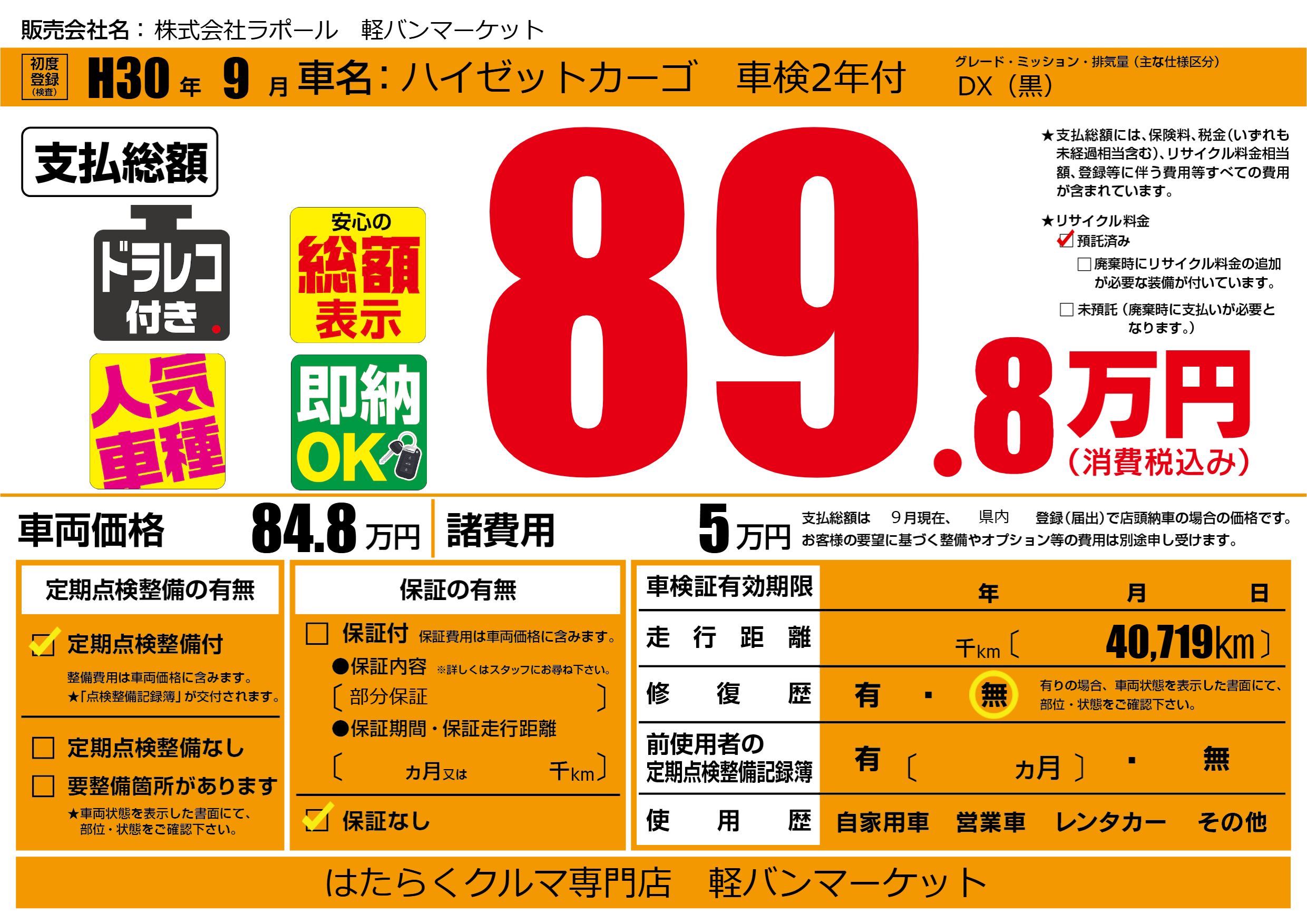 | 走行キロ | - | 初年度登録 | H30年9月 |