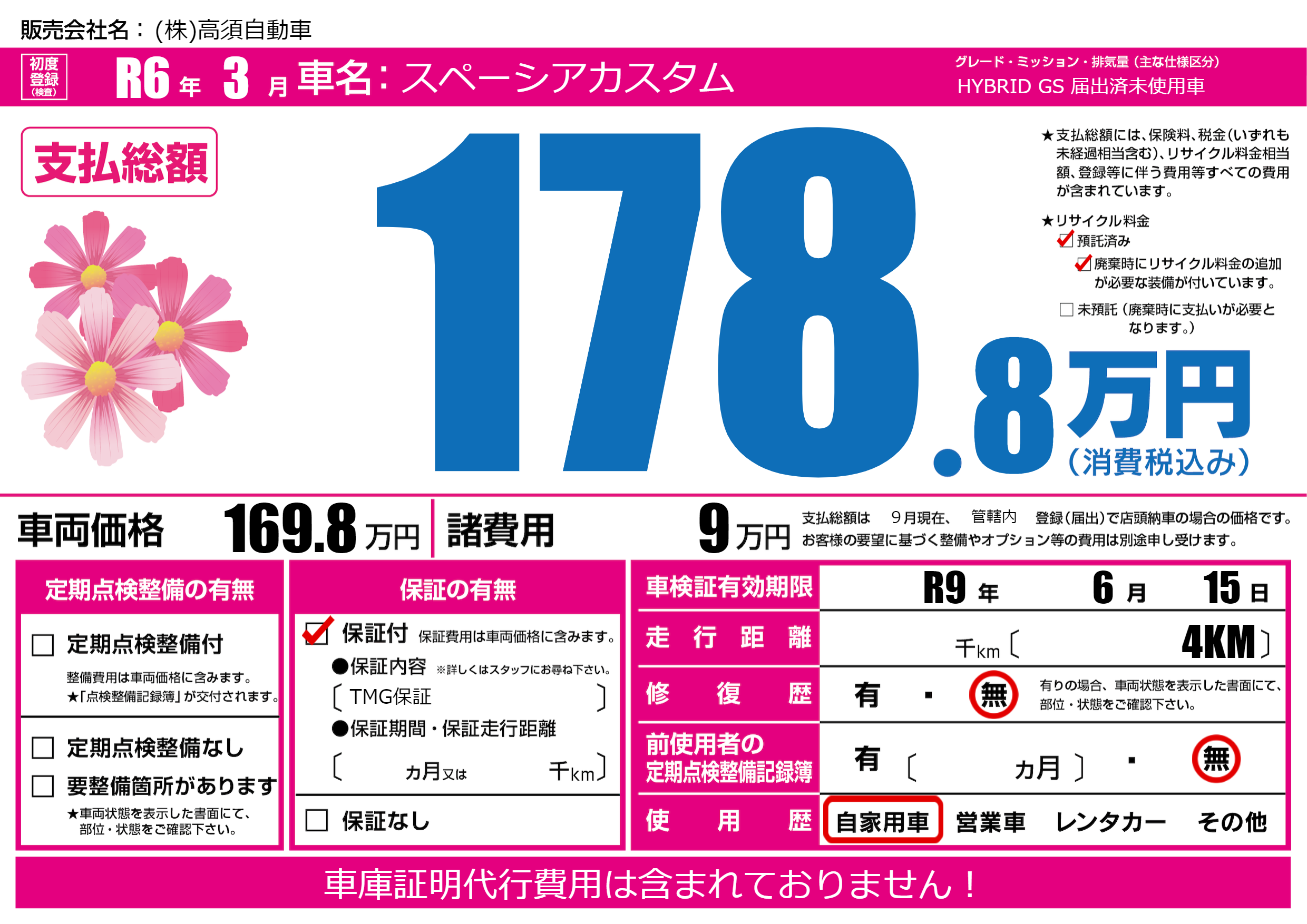 | 車名 | スペーシアカスタム | グレード ミッション 排気量 |