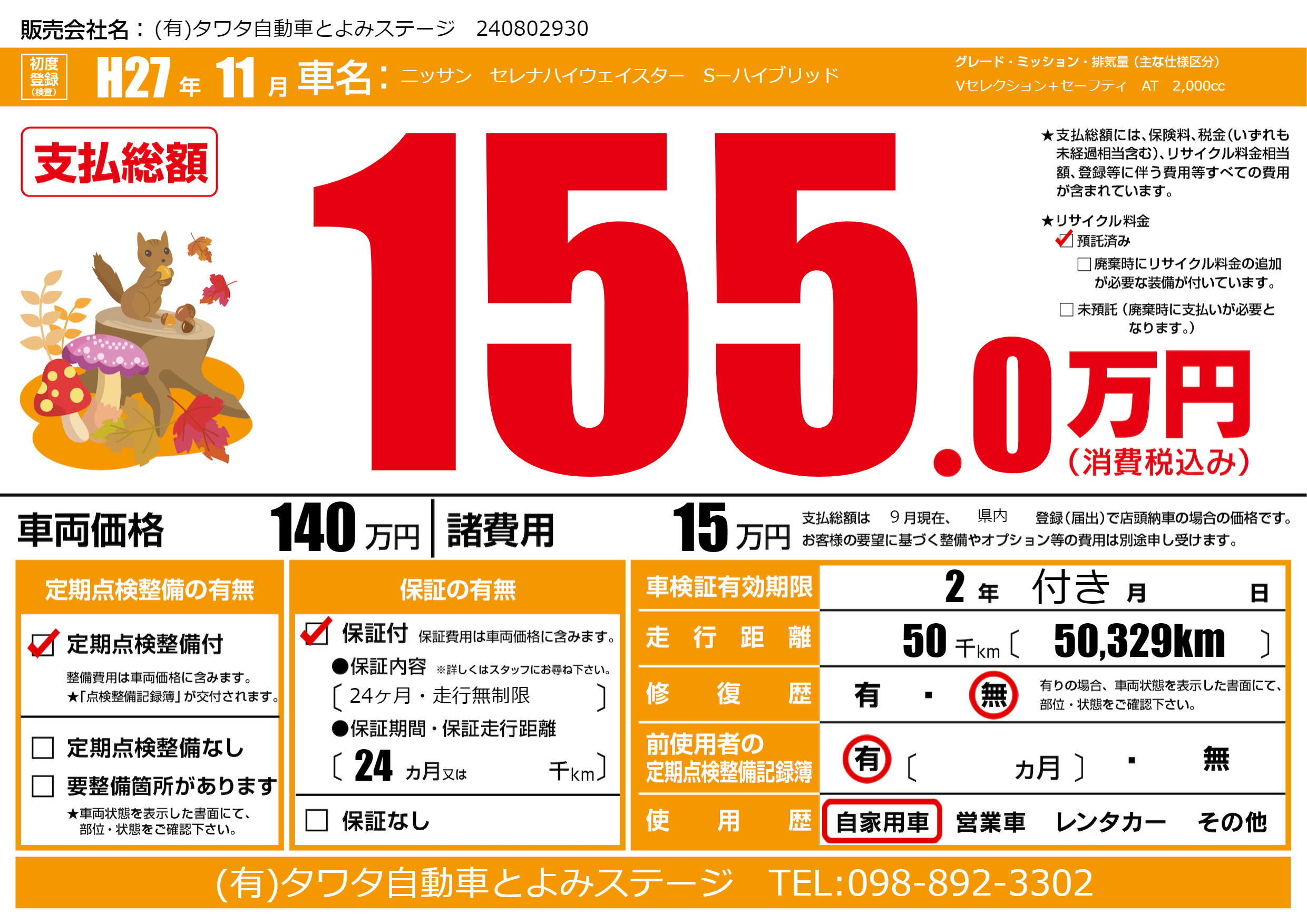 | 走行キロ | 5万km | 初年度登録 | H27年11月 |
