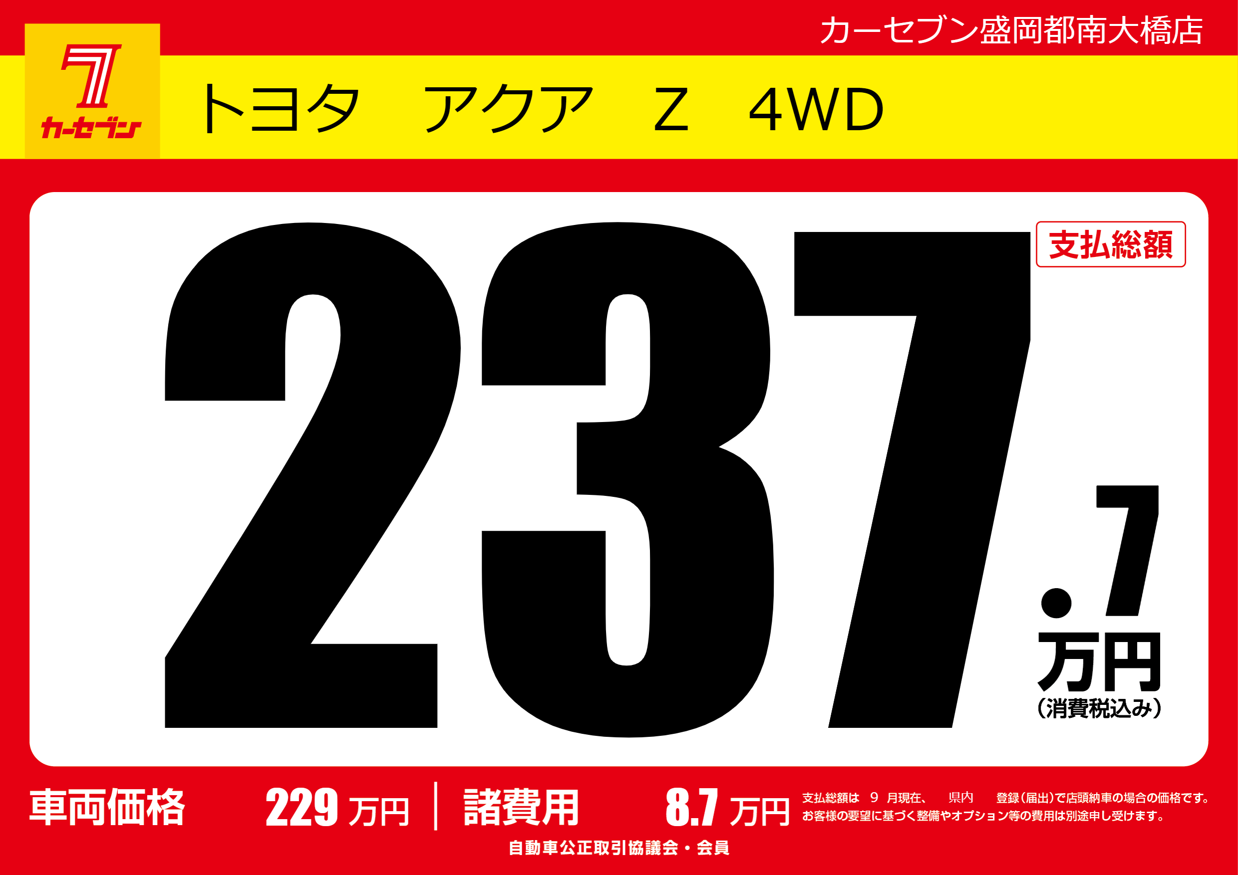 | 車名 | トヨタ アクア Z 4WD | グレード ミッション 排気量 |