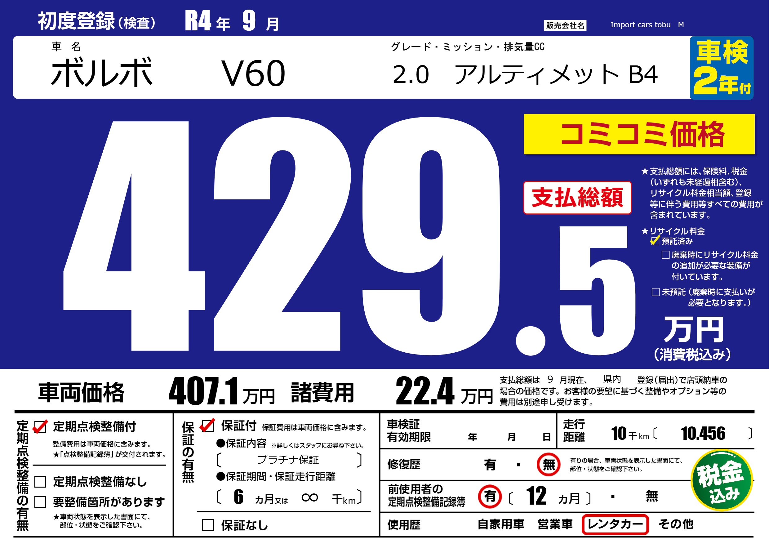 | 車名 | ボルボ V60 | グレード ミッション 排気量 |