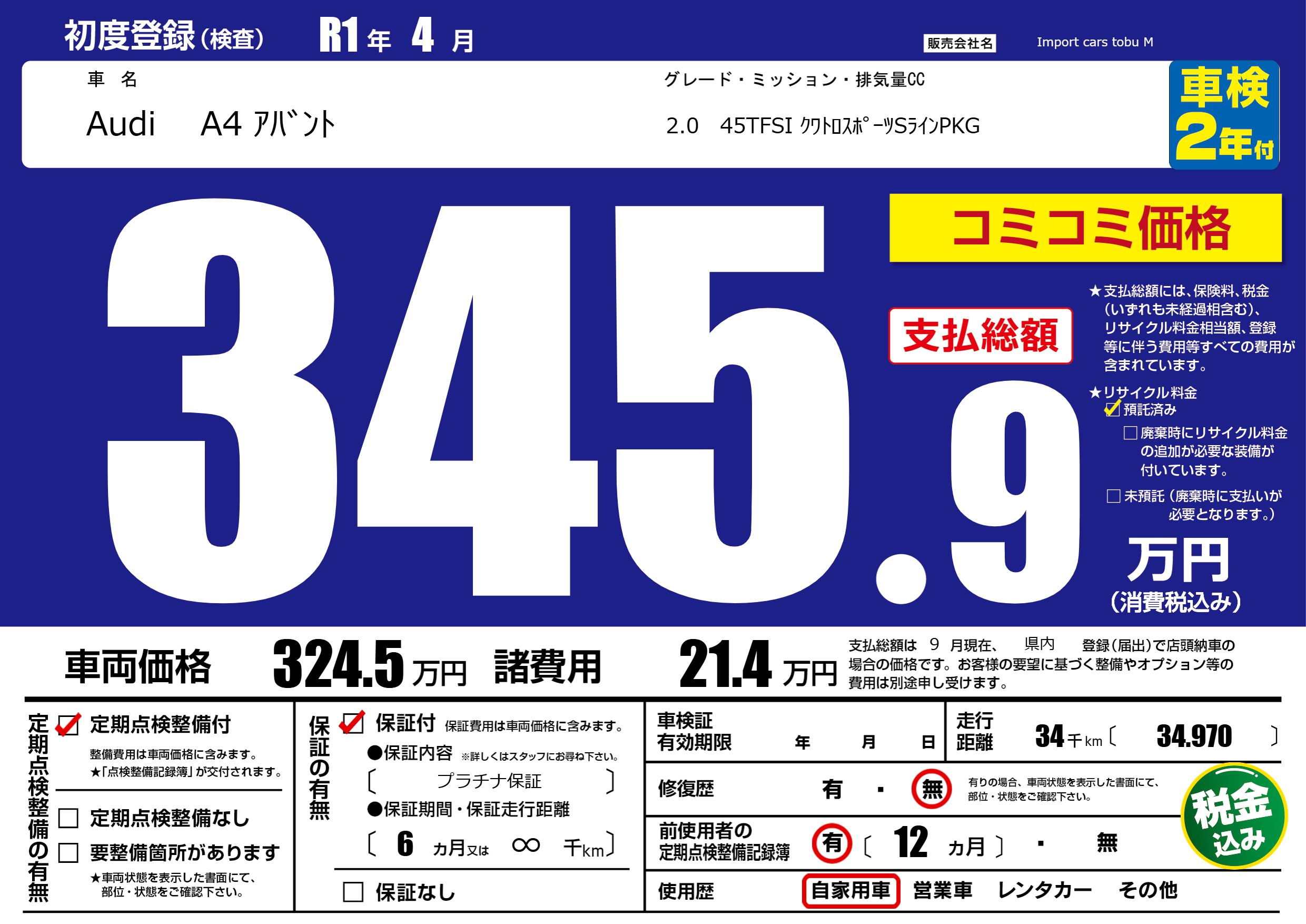 保証付き 保証内容( プラチナ保証) 6ヶ月または(∞)千kmまで |