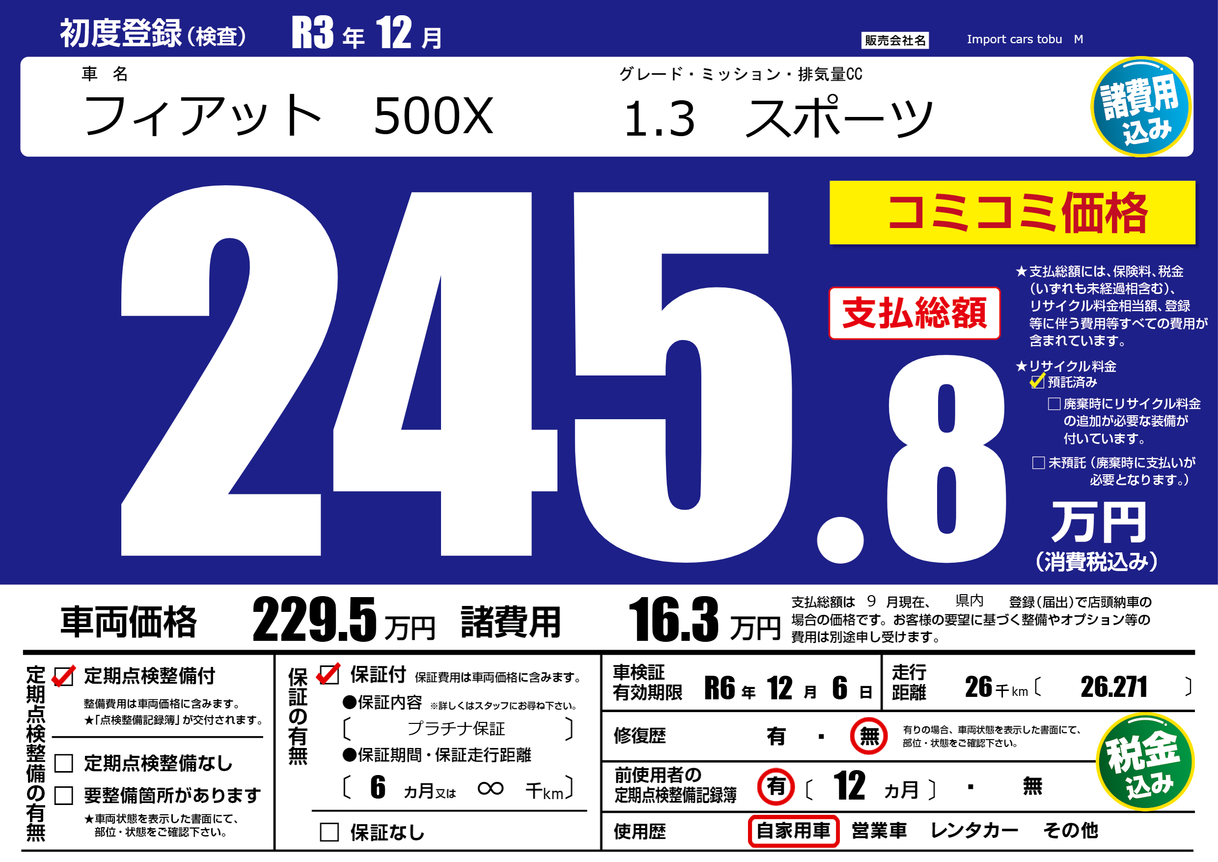 | 車名 | フィアット 500X | グレード ミッション 排気量 |