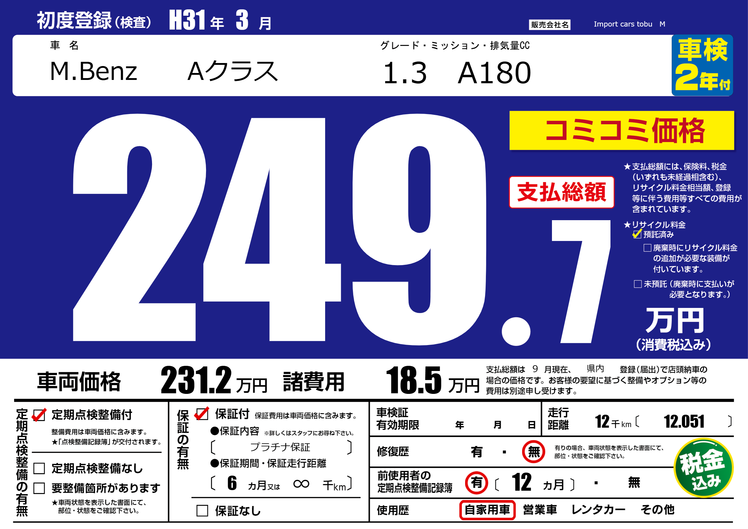 | 車名 | M.Benz Aクラス | グレード ミッション 排気量 |