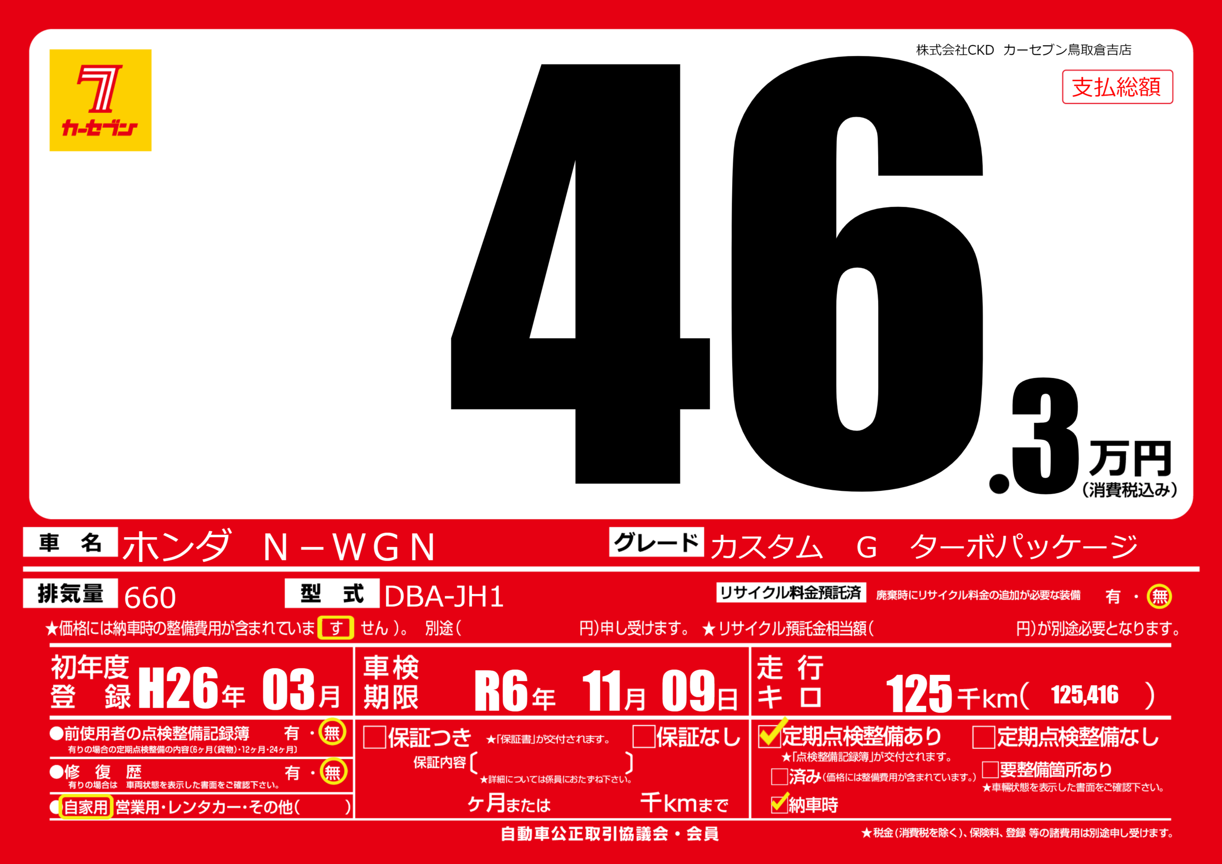 | 車名 | ホンダ N-WGN | グレード ミッション 排気量 |