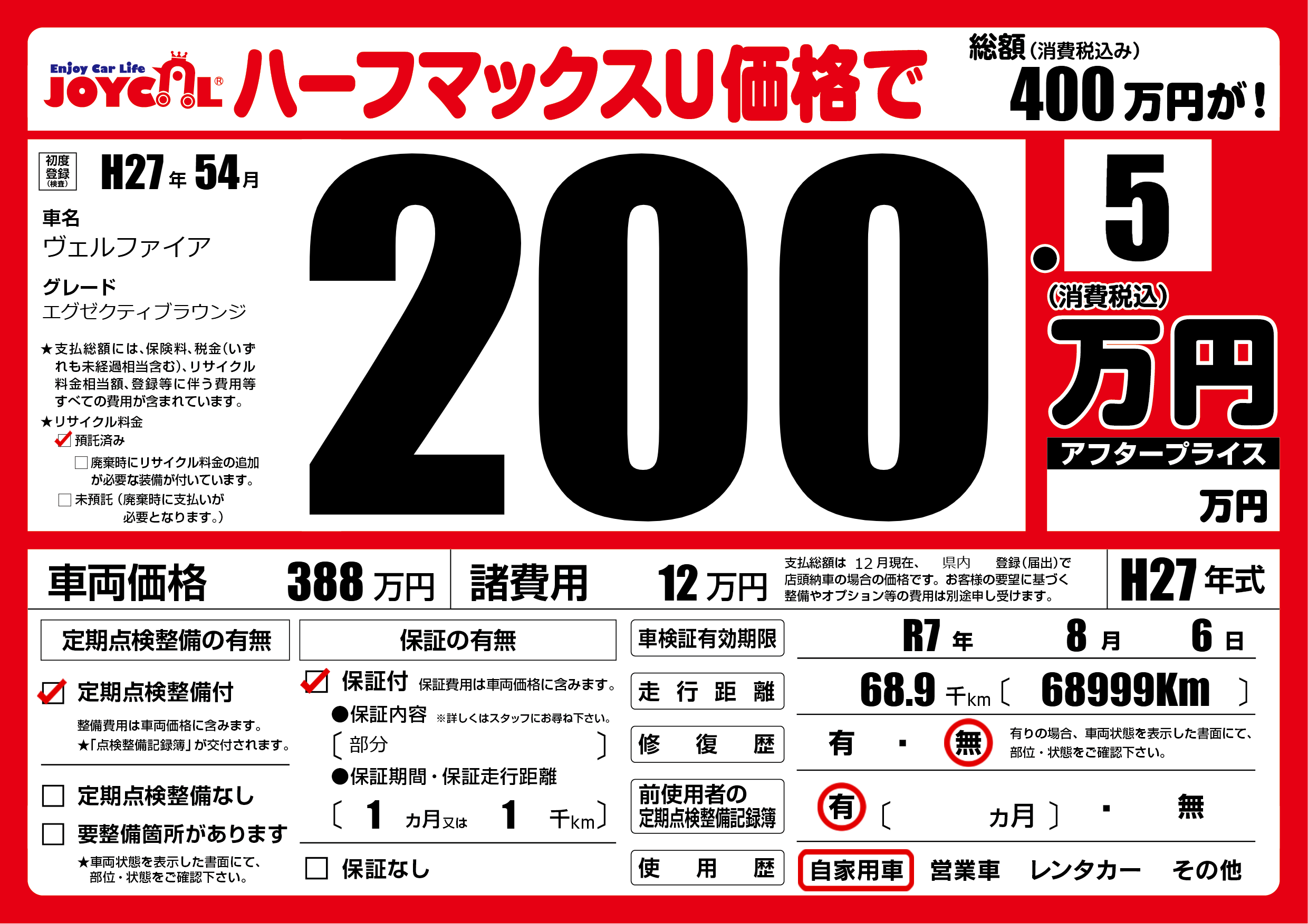 | 走行キロ | 6.8万km | 初年度登録 | H27年54月 |