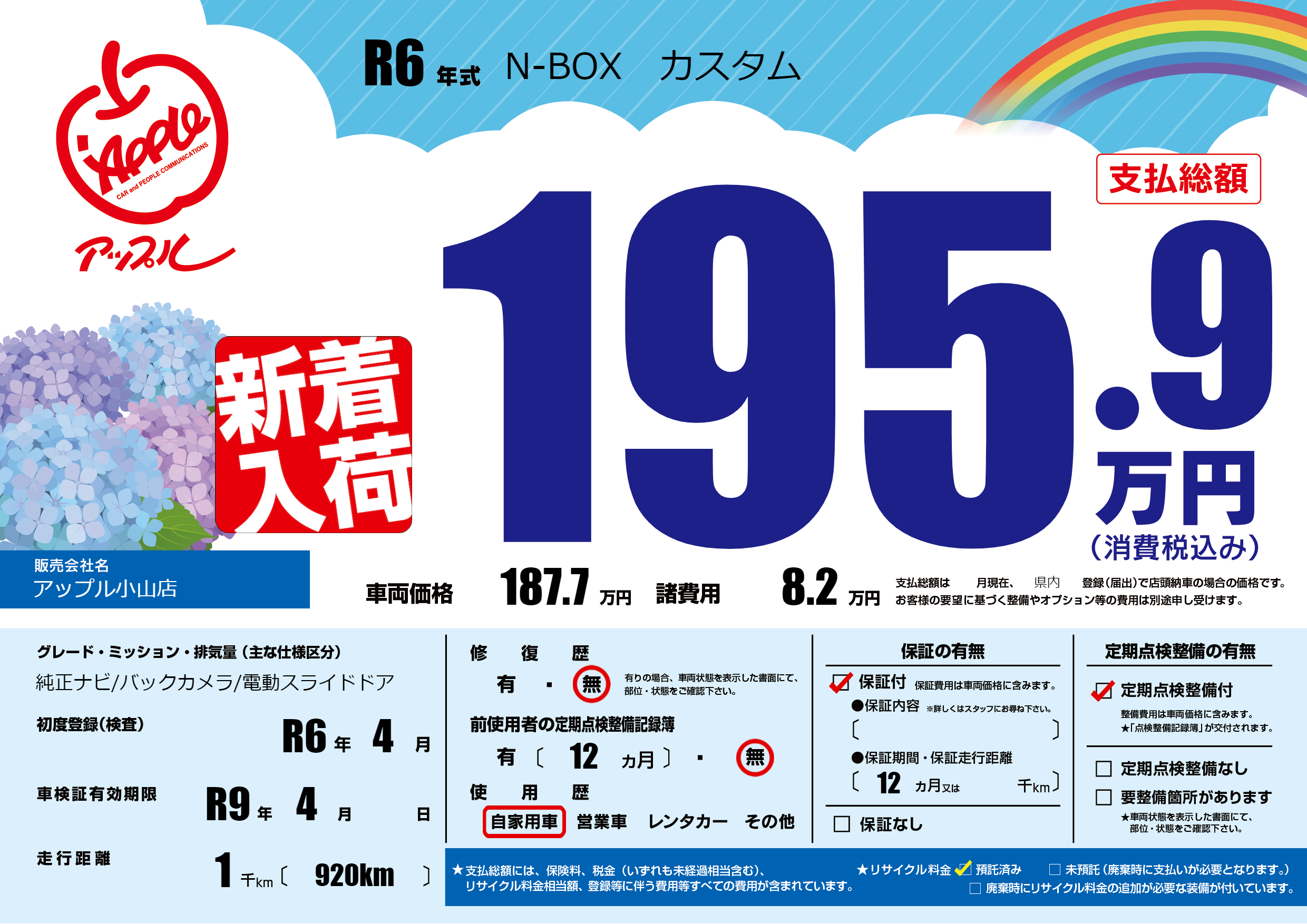 | 走行キロ | 0.1万km | 初年度登録 | R6年4月 |