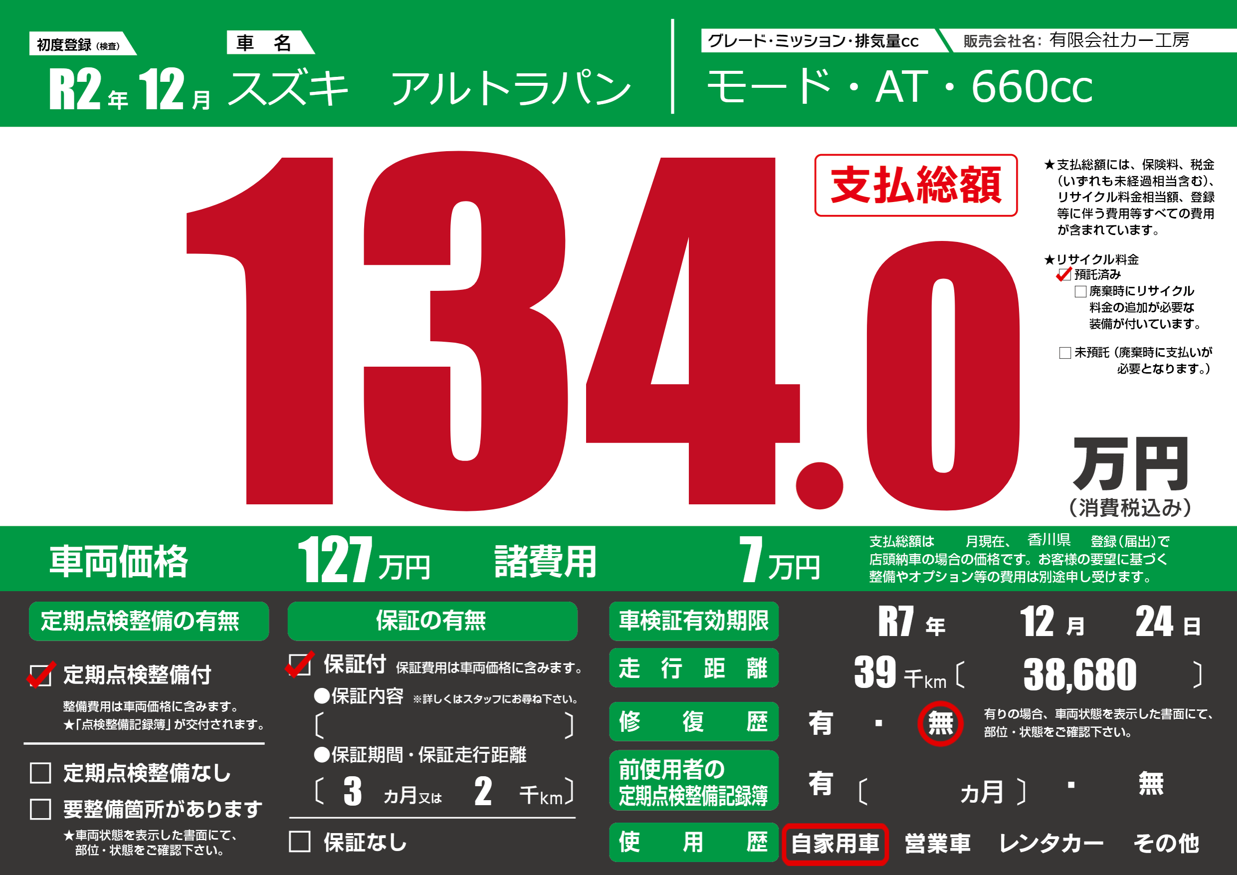 | 走行キロ | 3.9万km | 初年度登録 | R2年12月 |