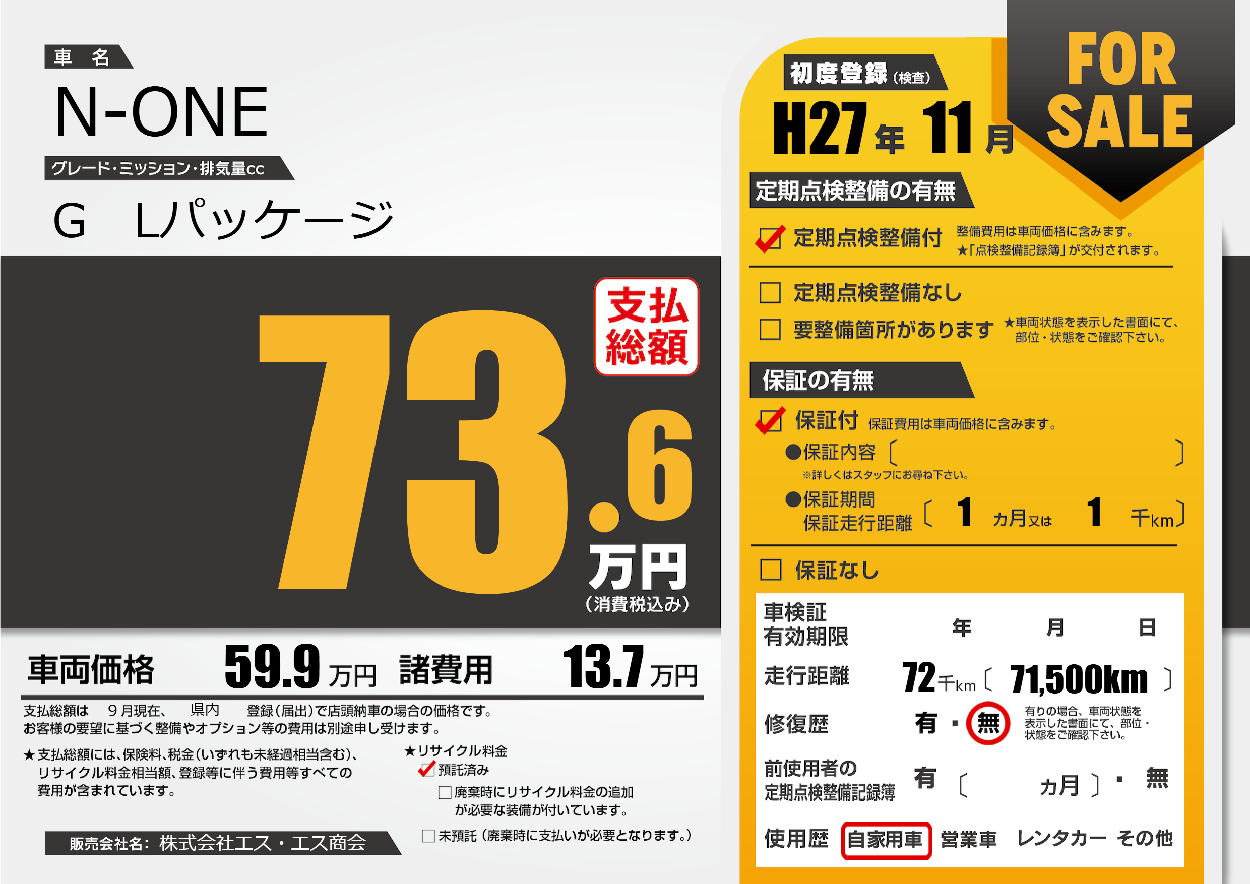 | 車名 | N-ONE | グレード ミッション 排気量 |