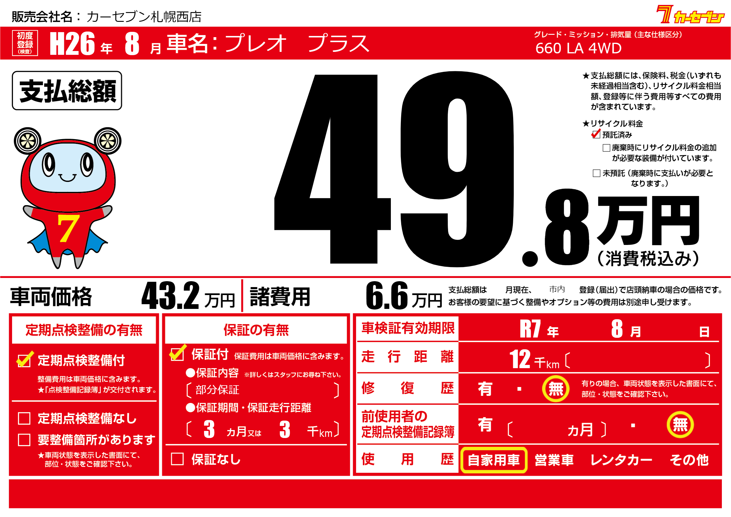 | 車名 | プレオ プラス | グレード ミッション 排気量 |