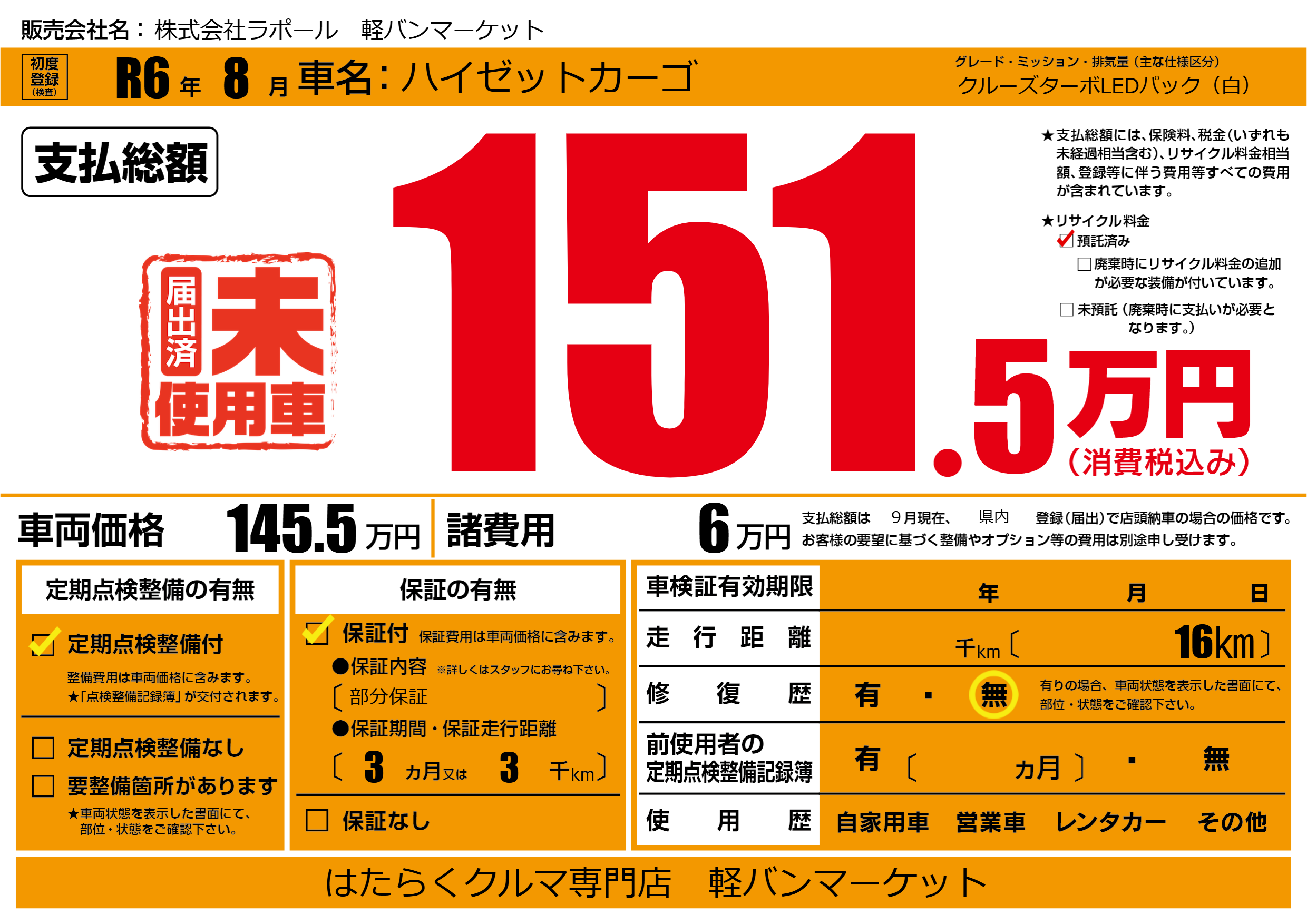 保証付き 保証内容(部分保証) 3ヶ月または(3)千kmまで |