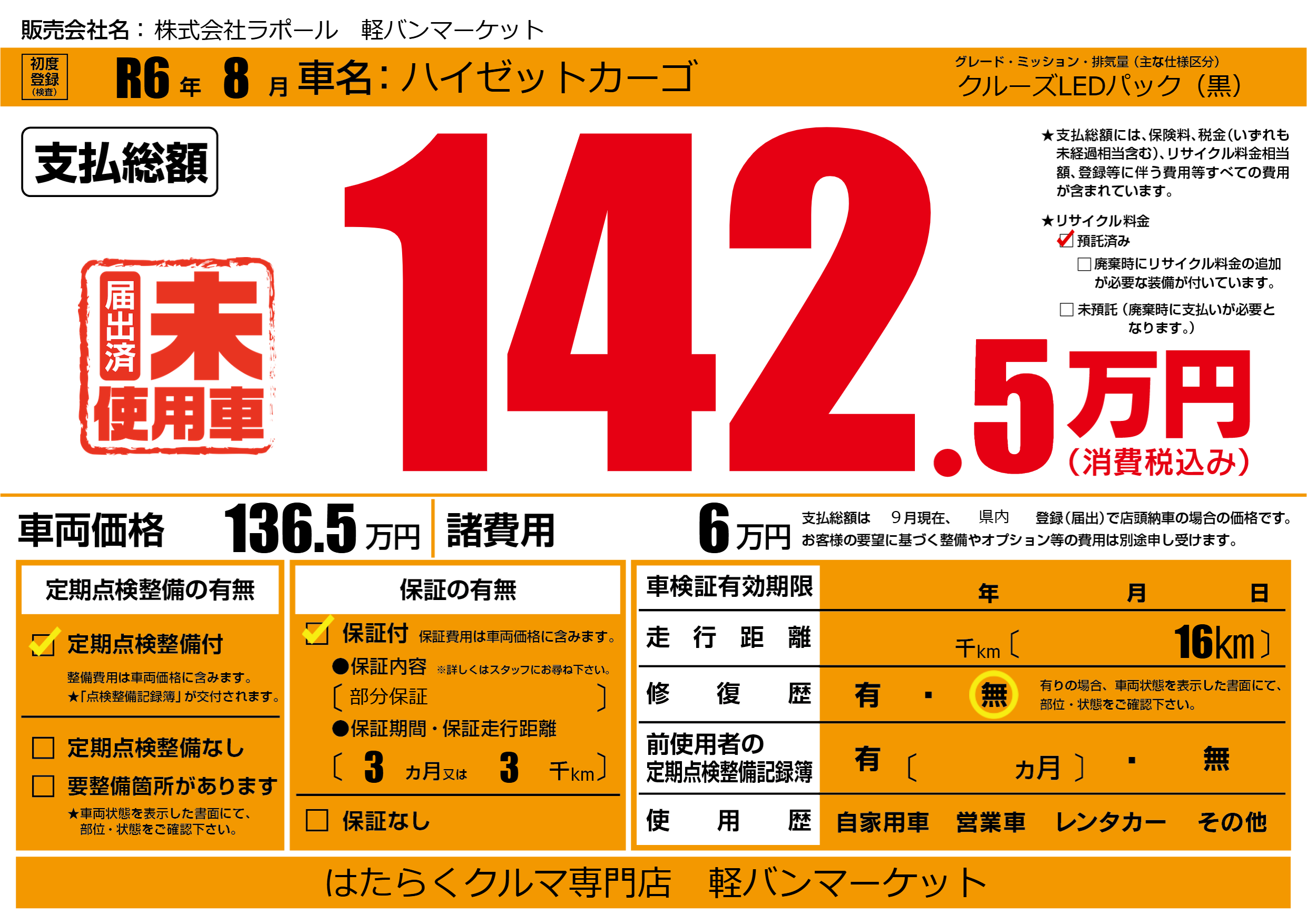 | 走行キロ | - | 初年度登録 | R6年8月 |