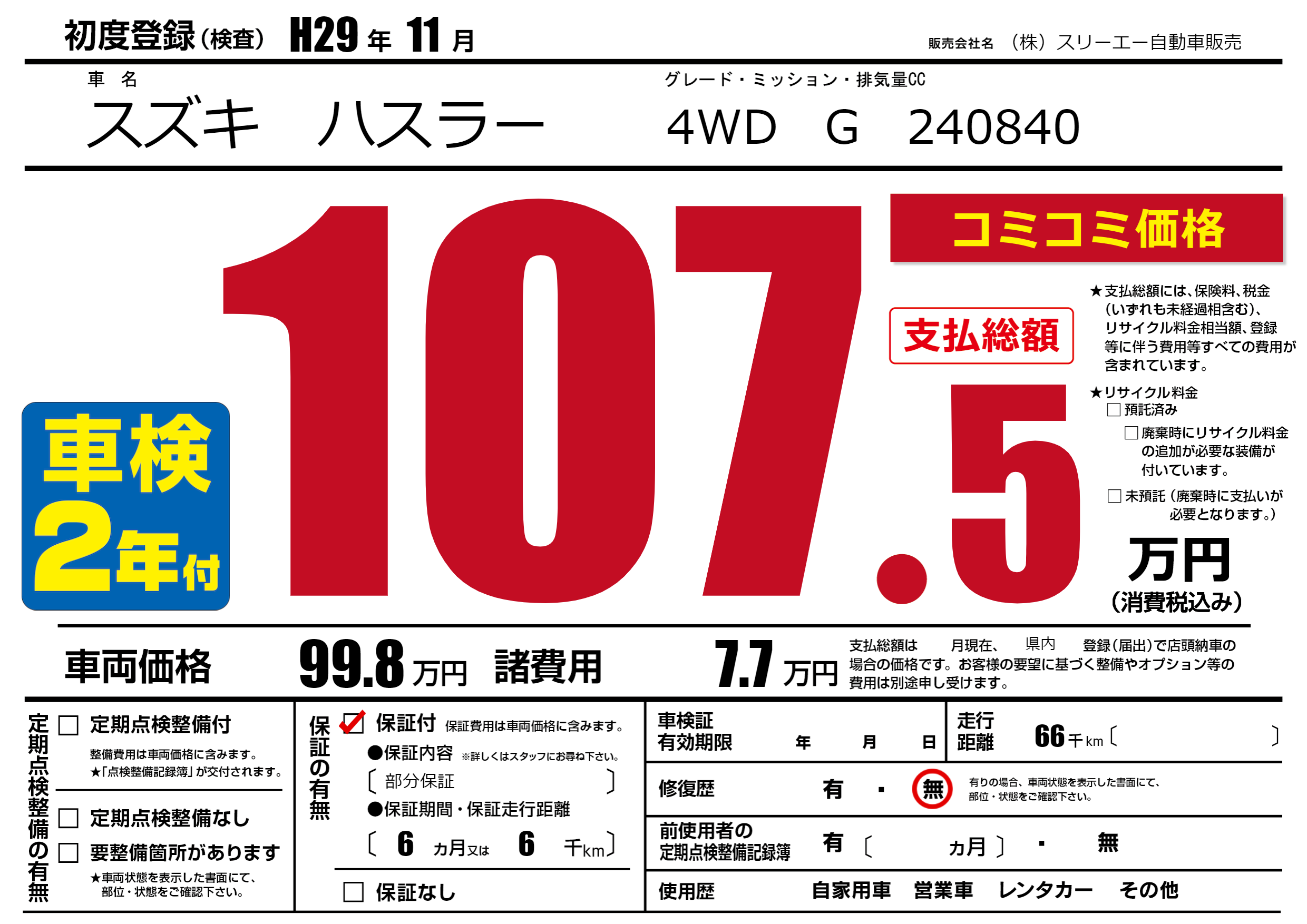 | 車名 | スズキ ハスラー | グレード ミッション 排気量 |
