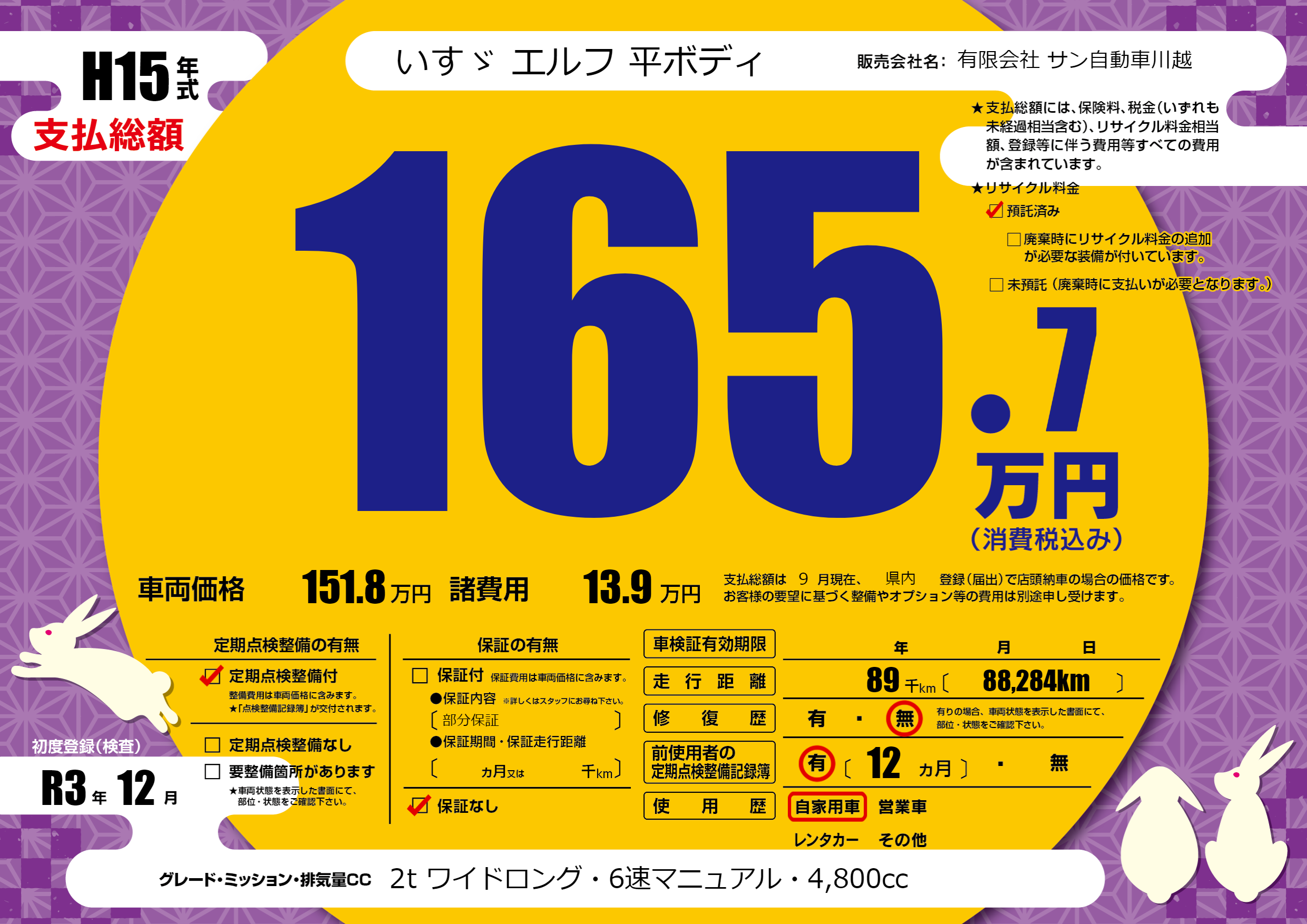 | 走行キロ | 8.9万km | 初年度登録 | R3年12月 |