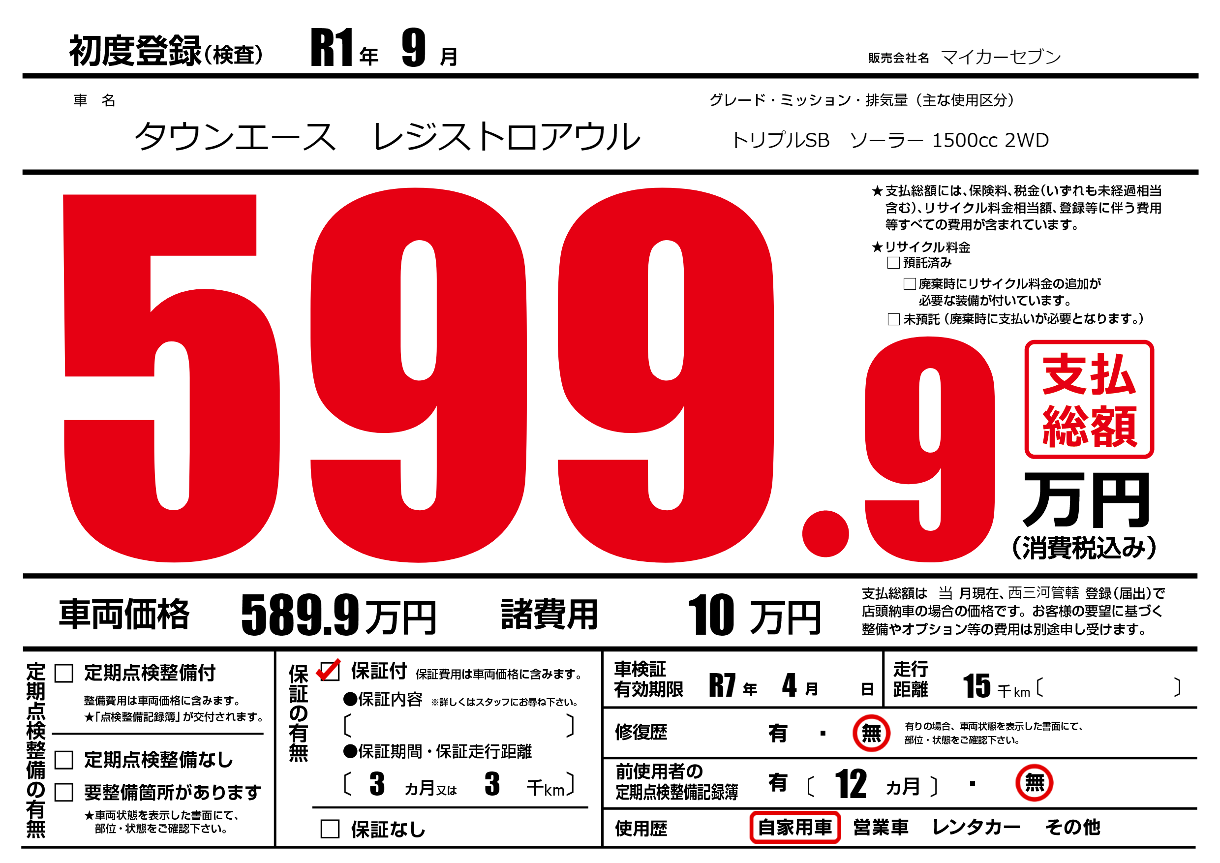 | 車名 | タウンエース レジストロアウル | グレード ミッション 排気量 |