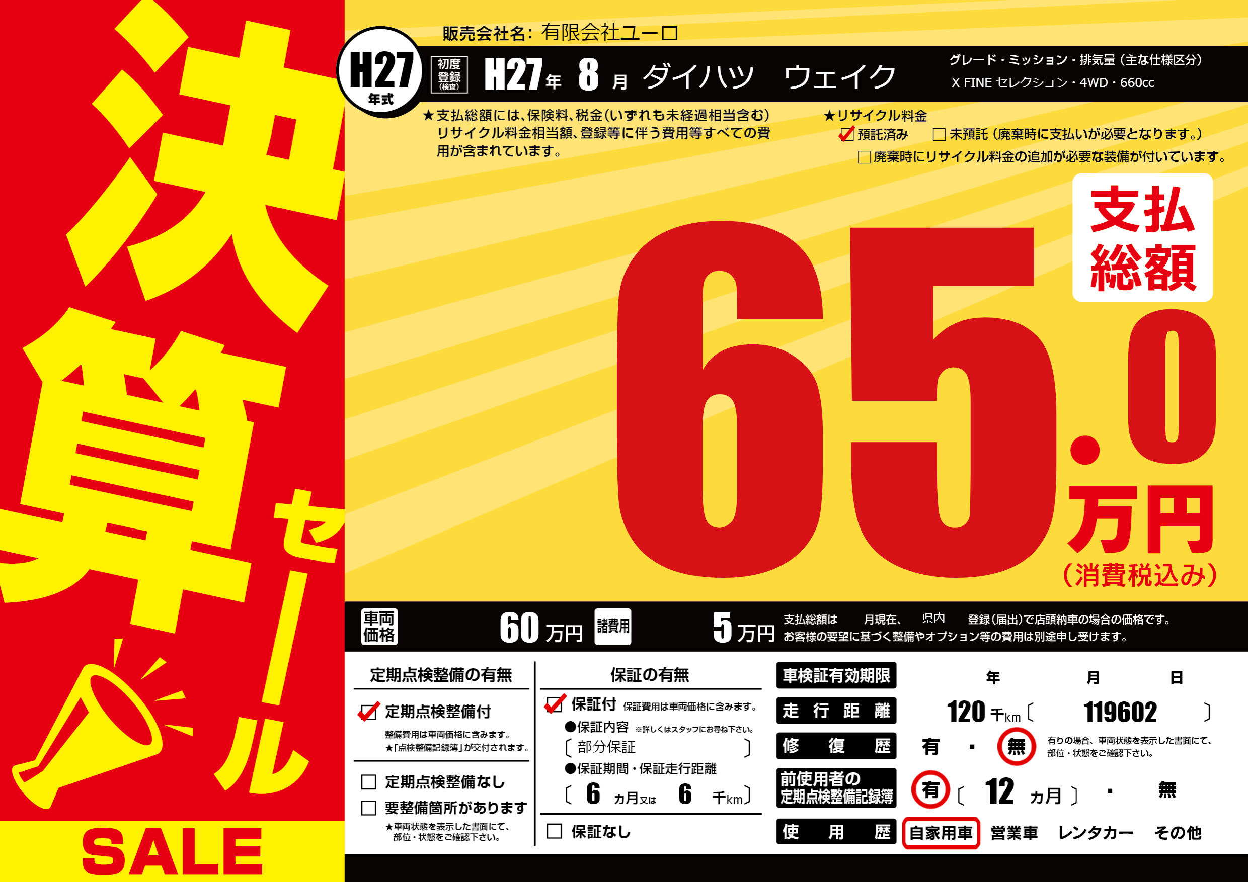 | 走行キロ | 12万km | 初年度登録 | H27年8月 |