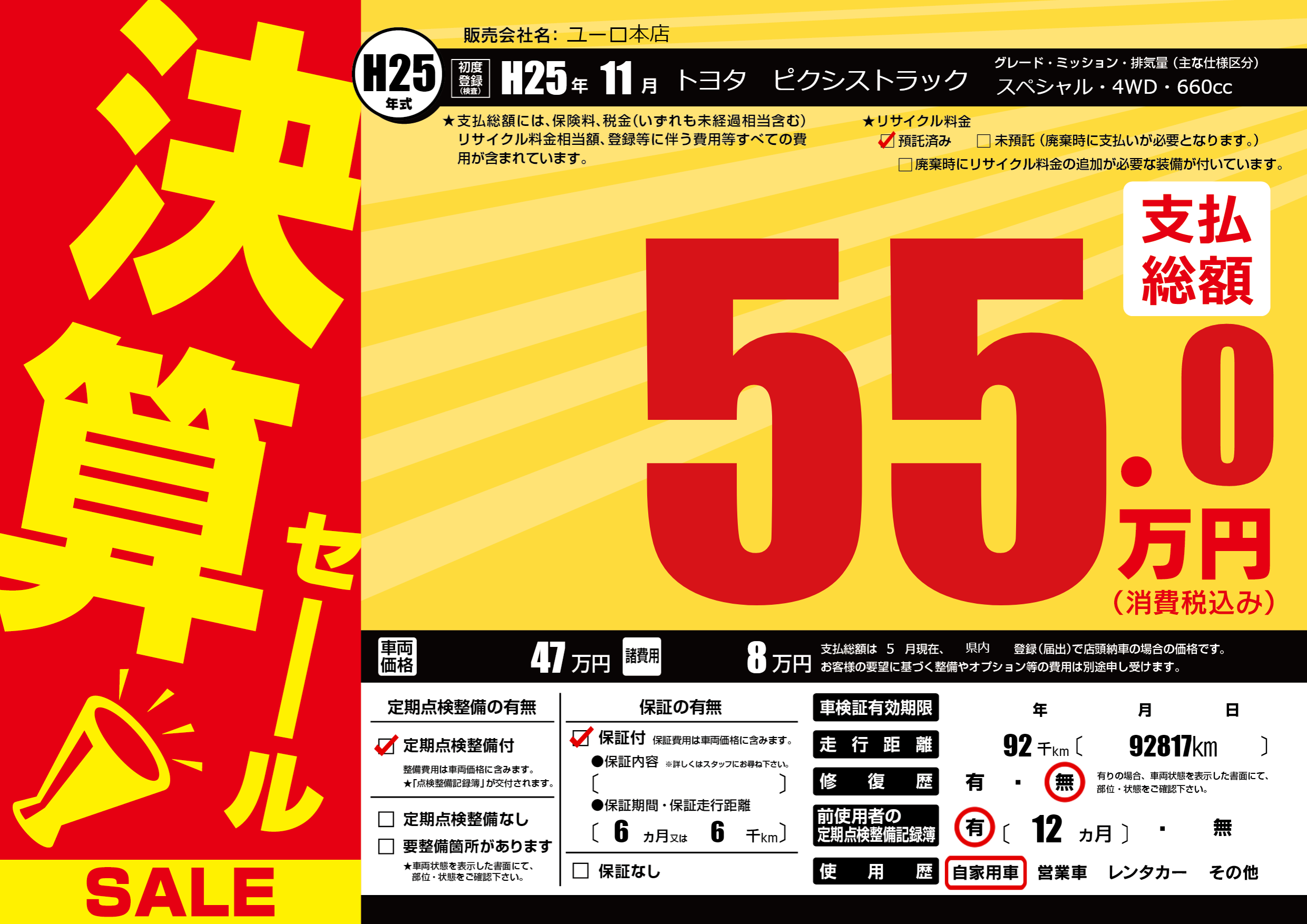 | 走行キロ | 9.2万km | 初年度登録 | H25年11月 |