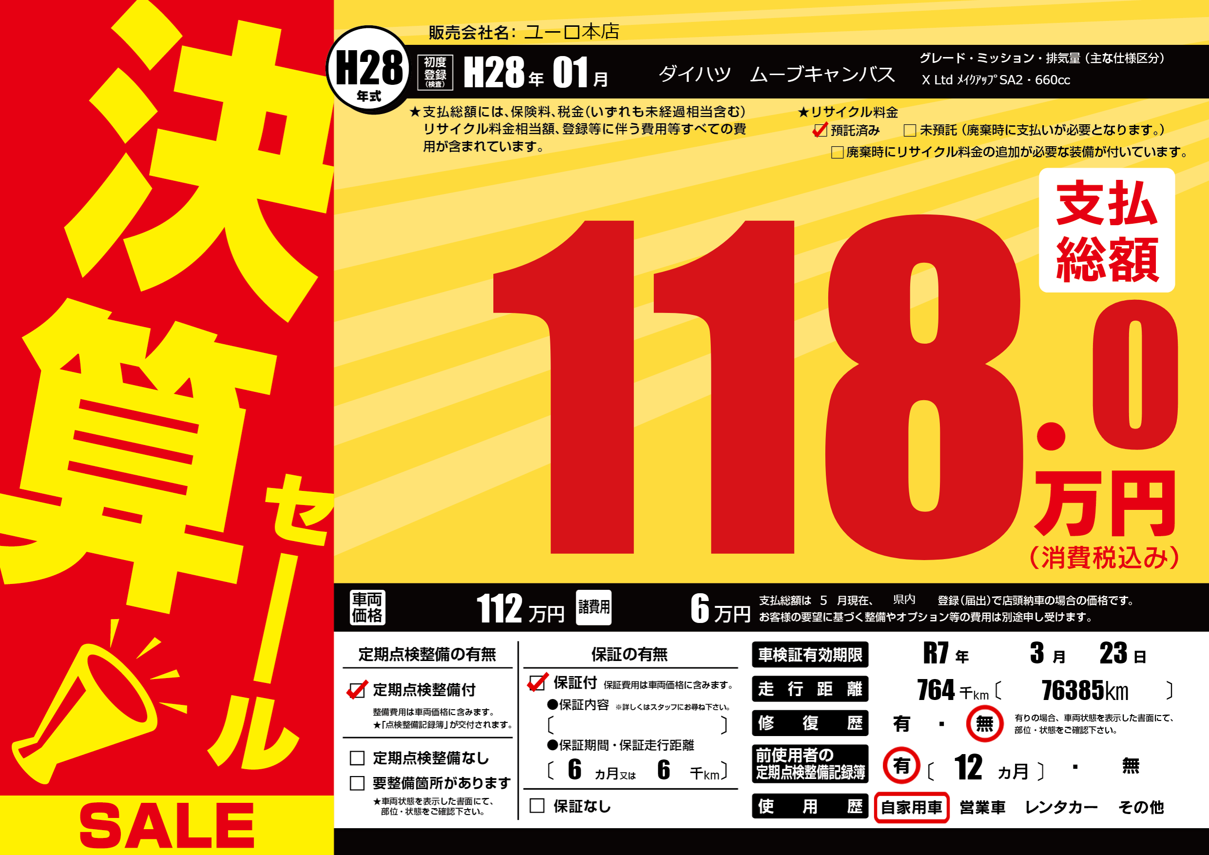 | 走行キロ | 76.4万km | 初年度登録 | H28年01月 |