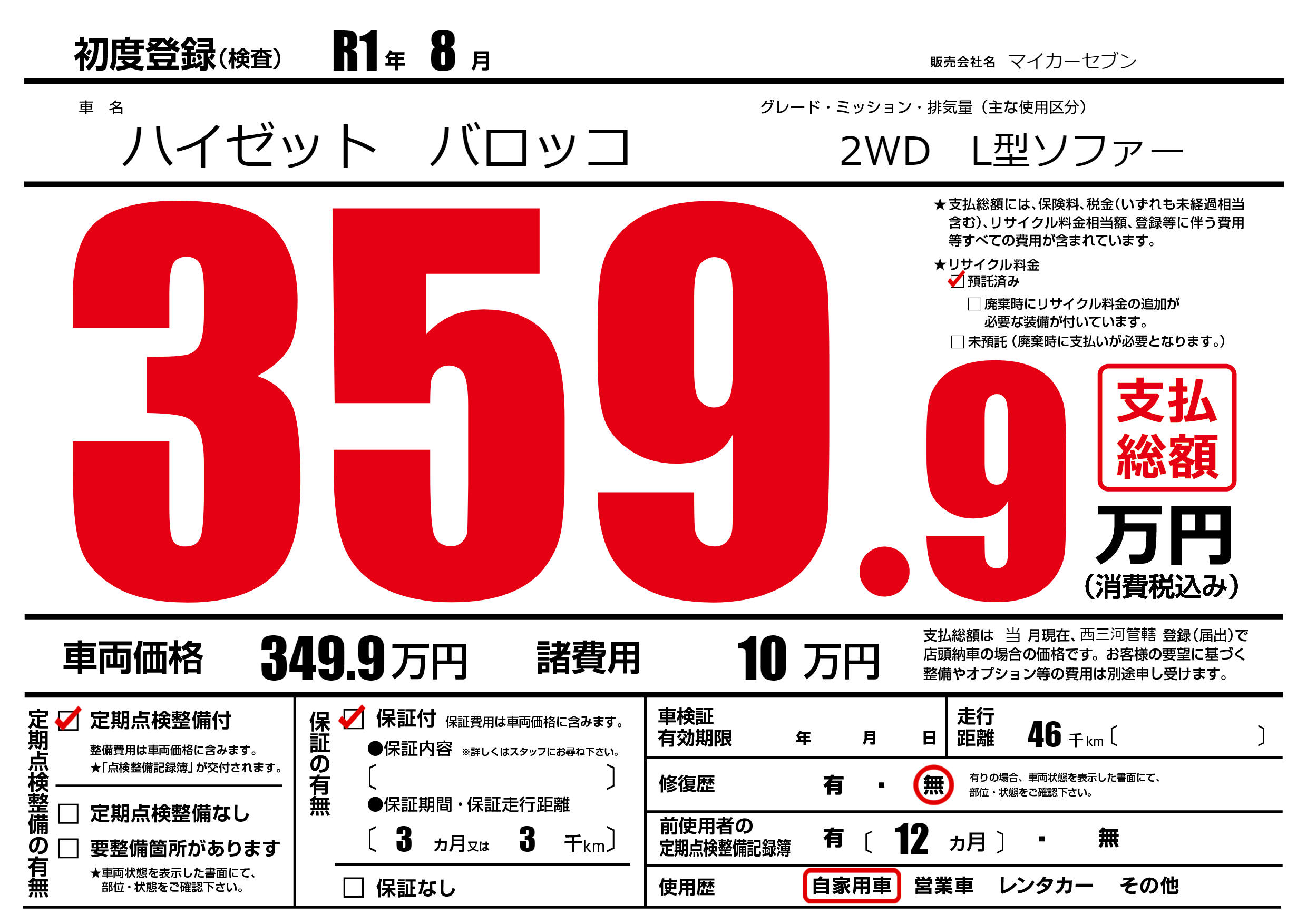 保証付き 保証内容(---) 3ヶ月または(3)千kmまで |