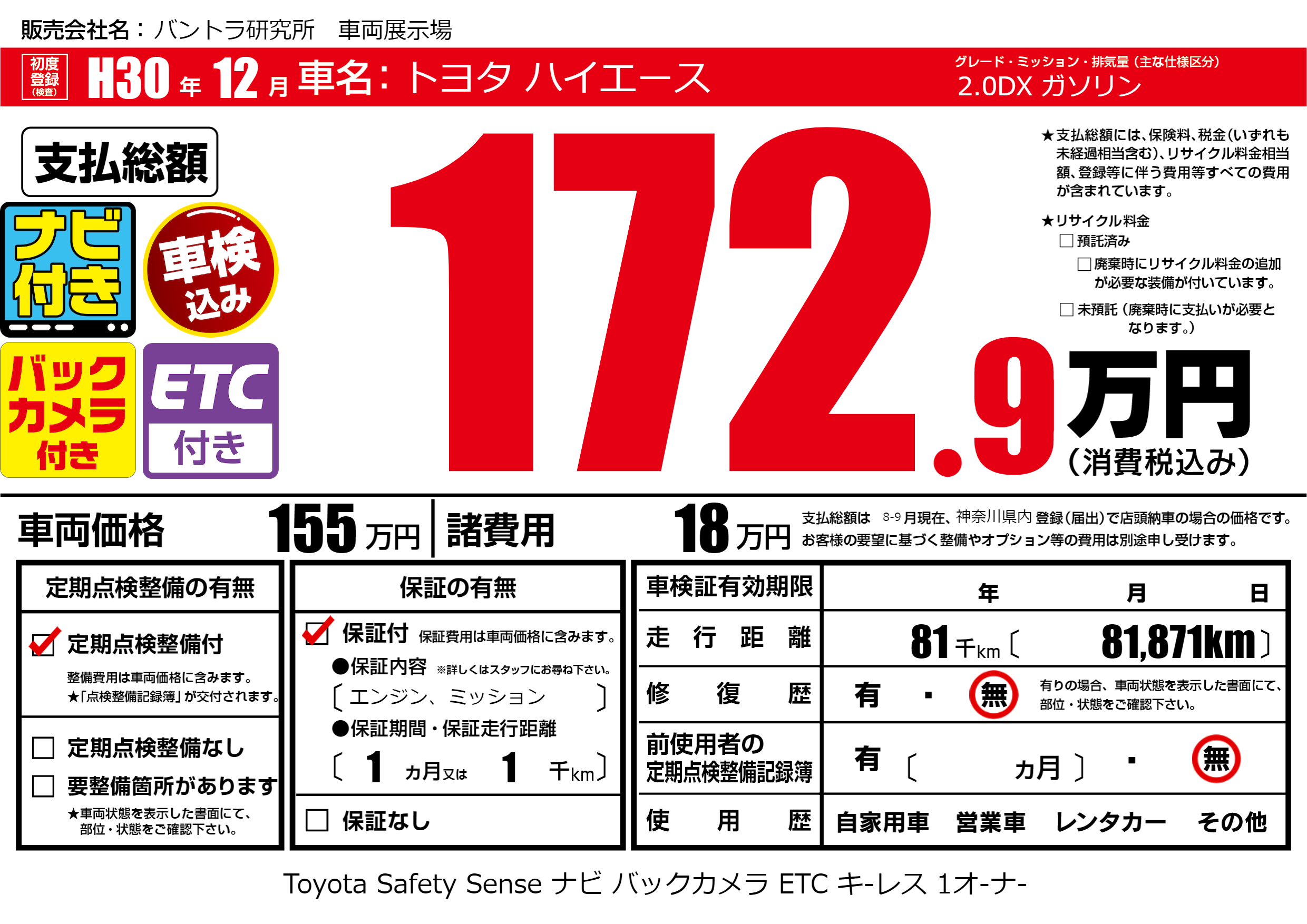 | 走行キロ | 8.1万km | 初年度登録 | H30年12月 |