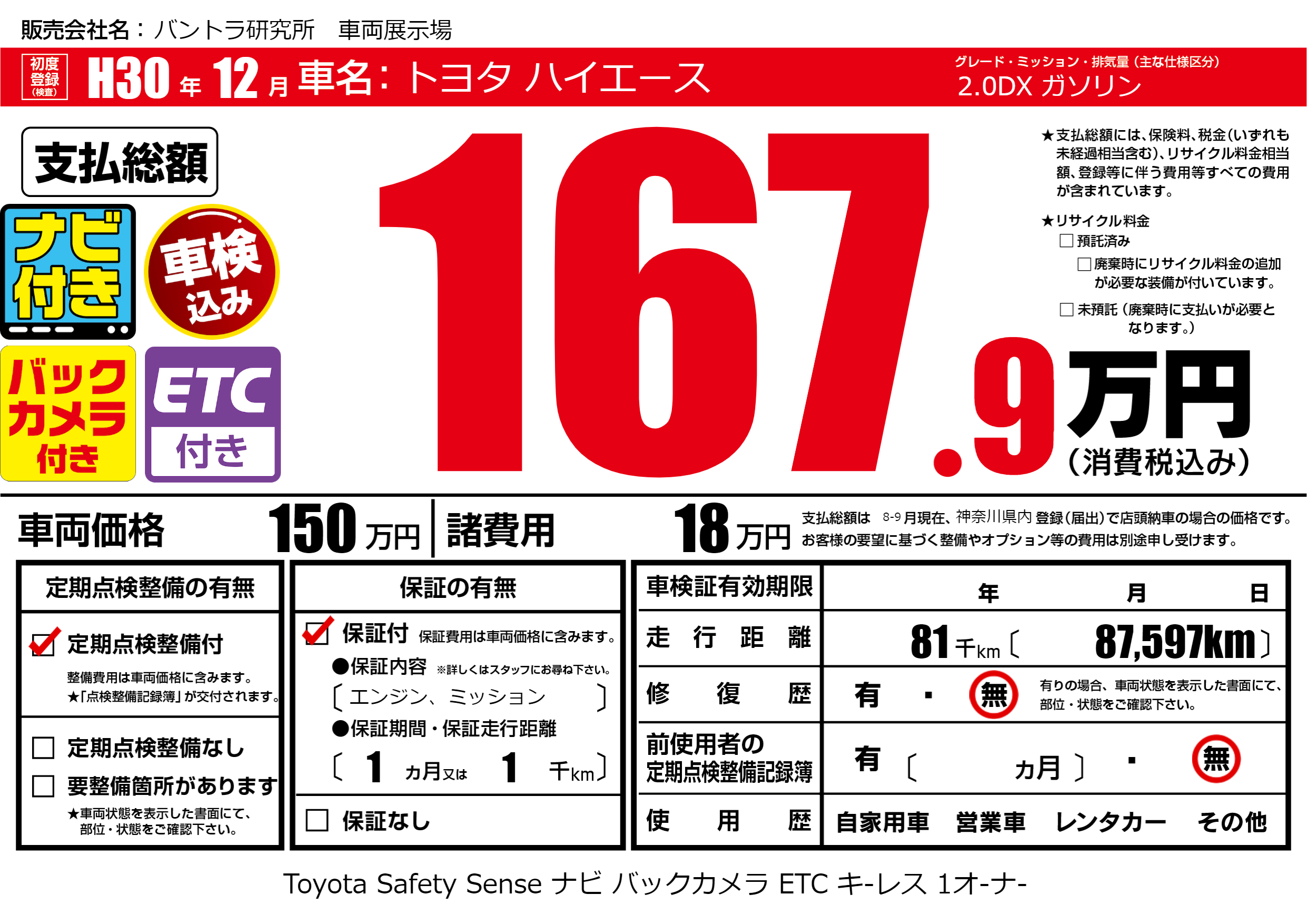 | 車名 | トヨタ ハイエース | グレード ミッション 排気量 |