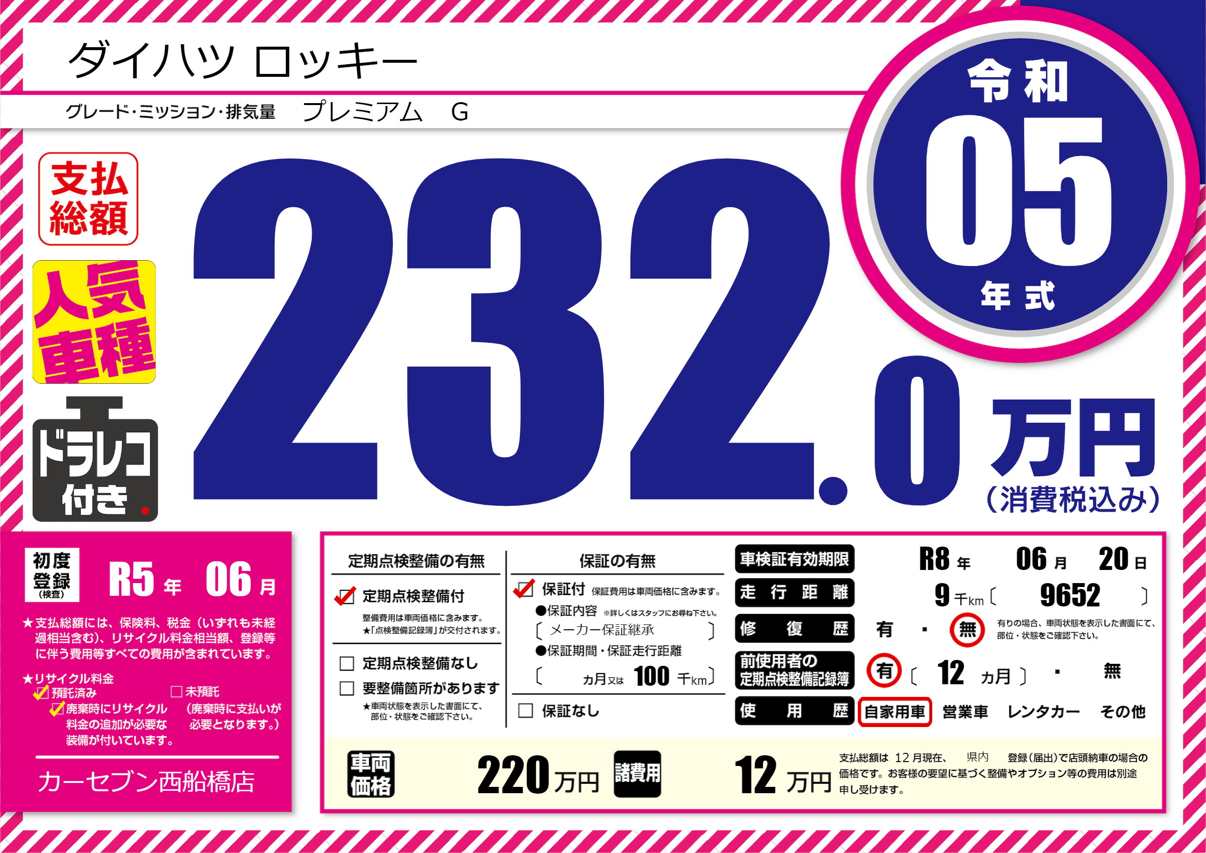| 車名 | ダイハツ ロッキー | グレード ミッション 排気量 |