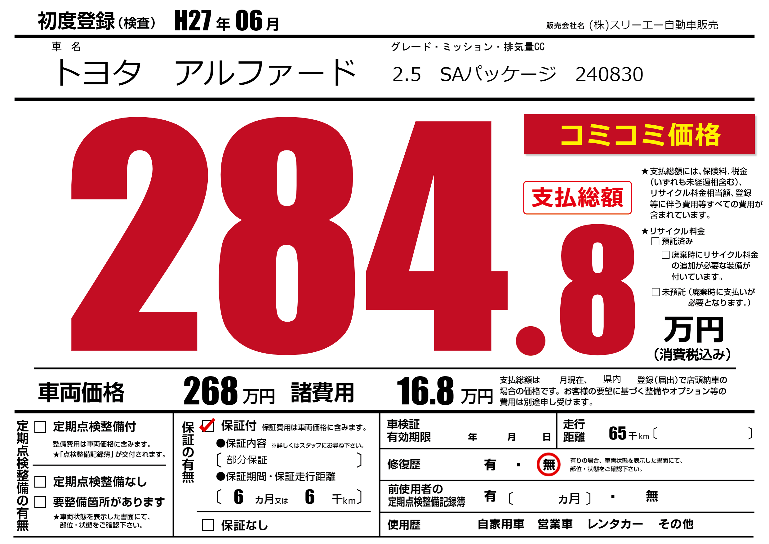 | 走行キロ | 6.5万km | 初年度登録 | H27年06月 |