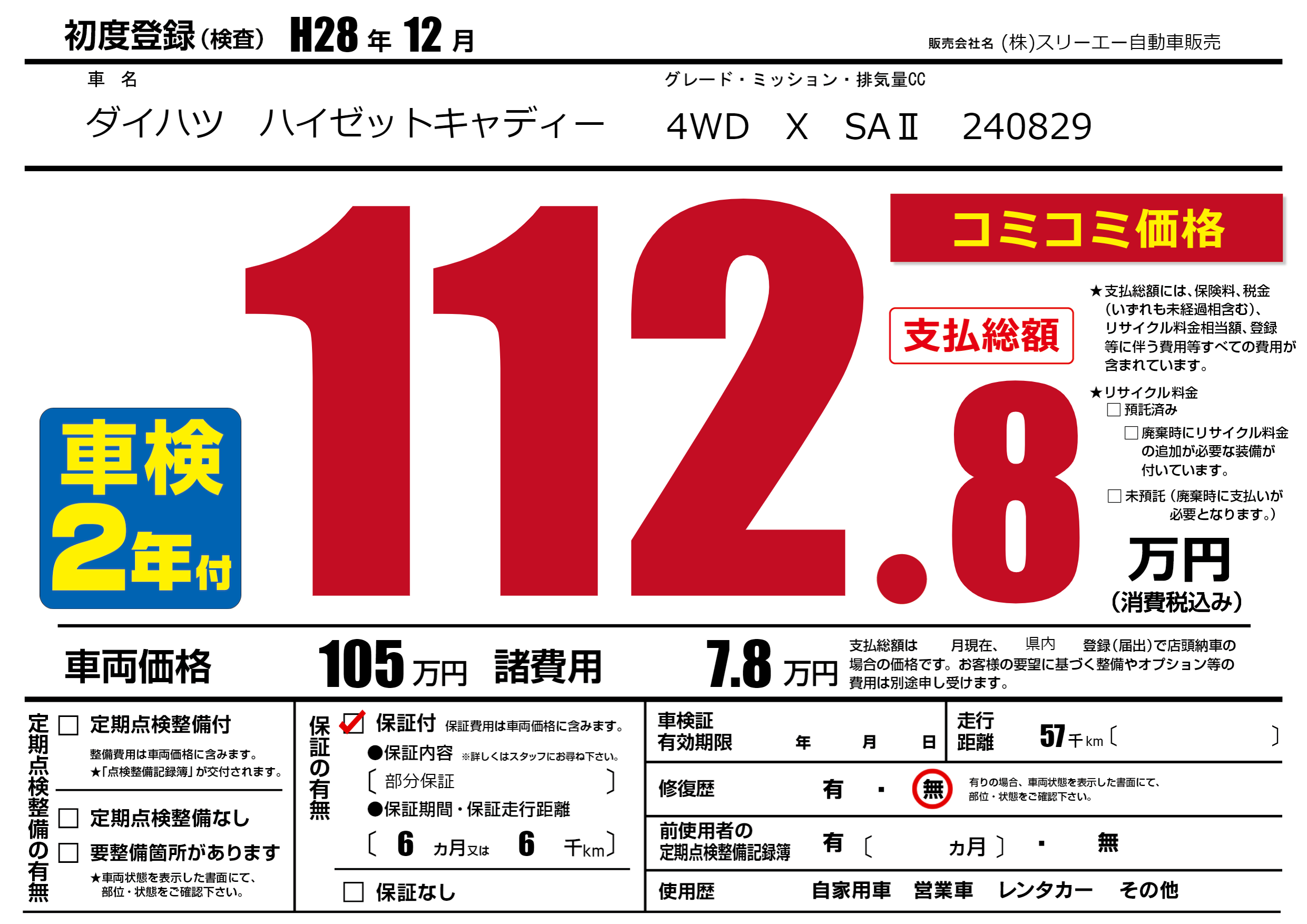 保証付き 保証内容(部分保証) 6ヶ月または(6)千kmまで |