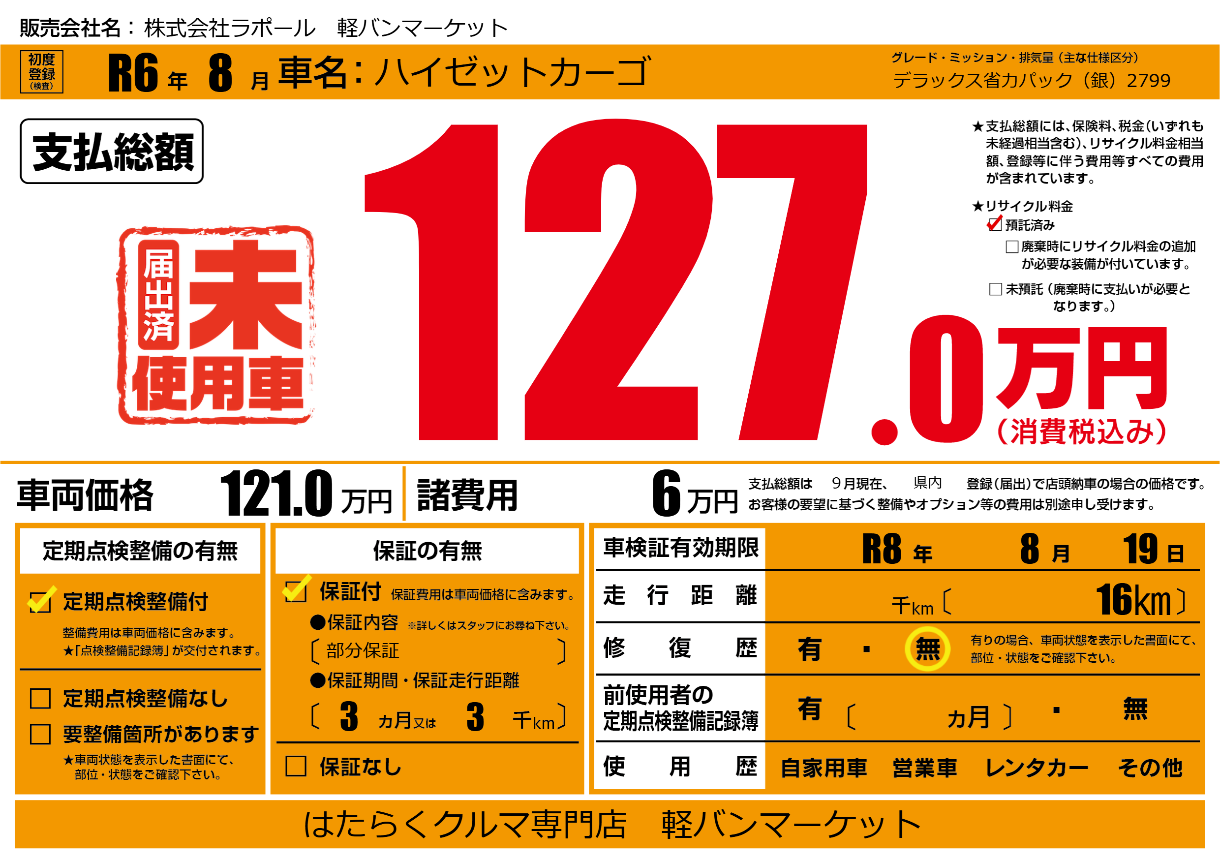 | 走行キロ | - | 初年度登録 | R6年8月 |