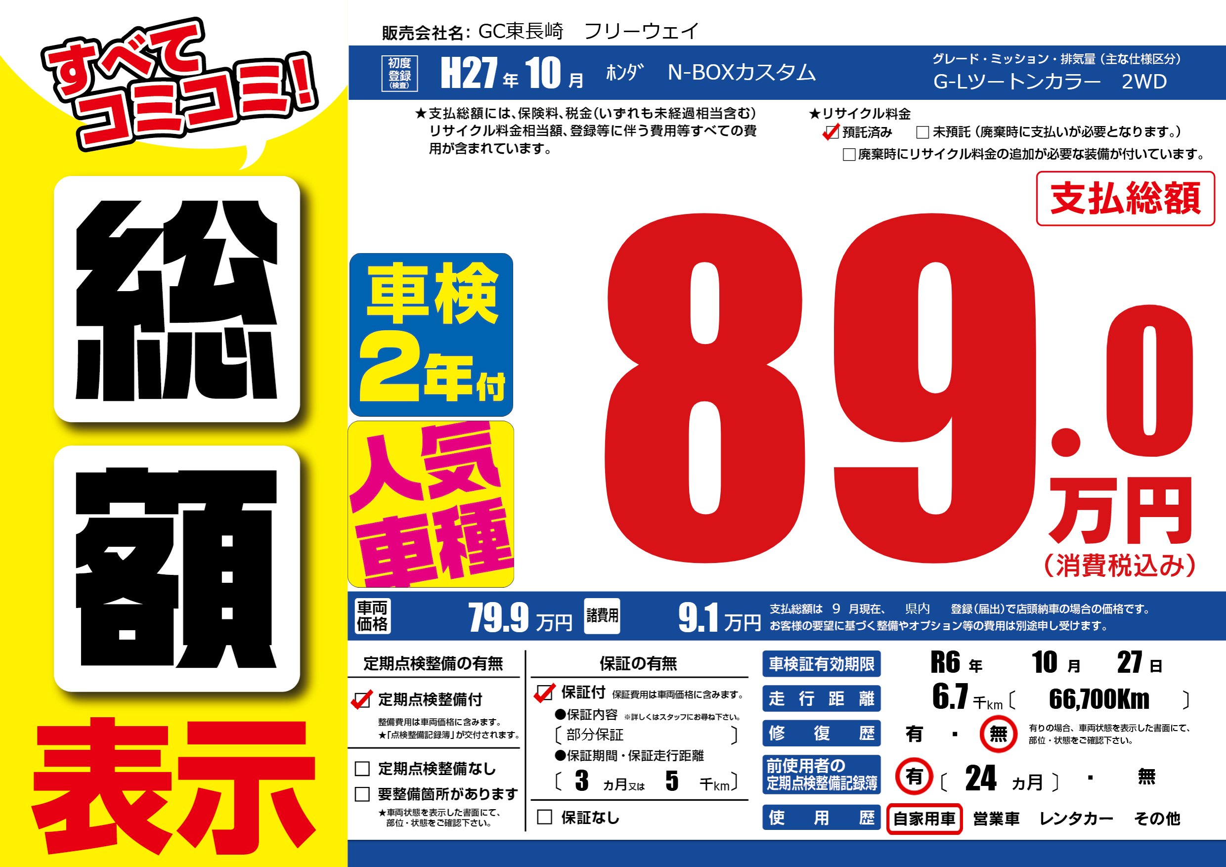 | 車名 | ホンダ N-BOXカスタム | グレード ミッション 排気量 |